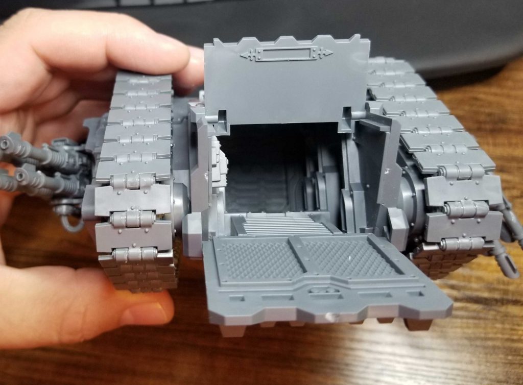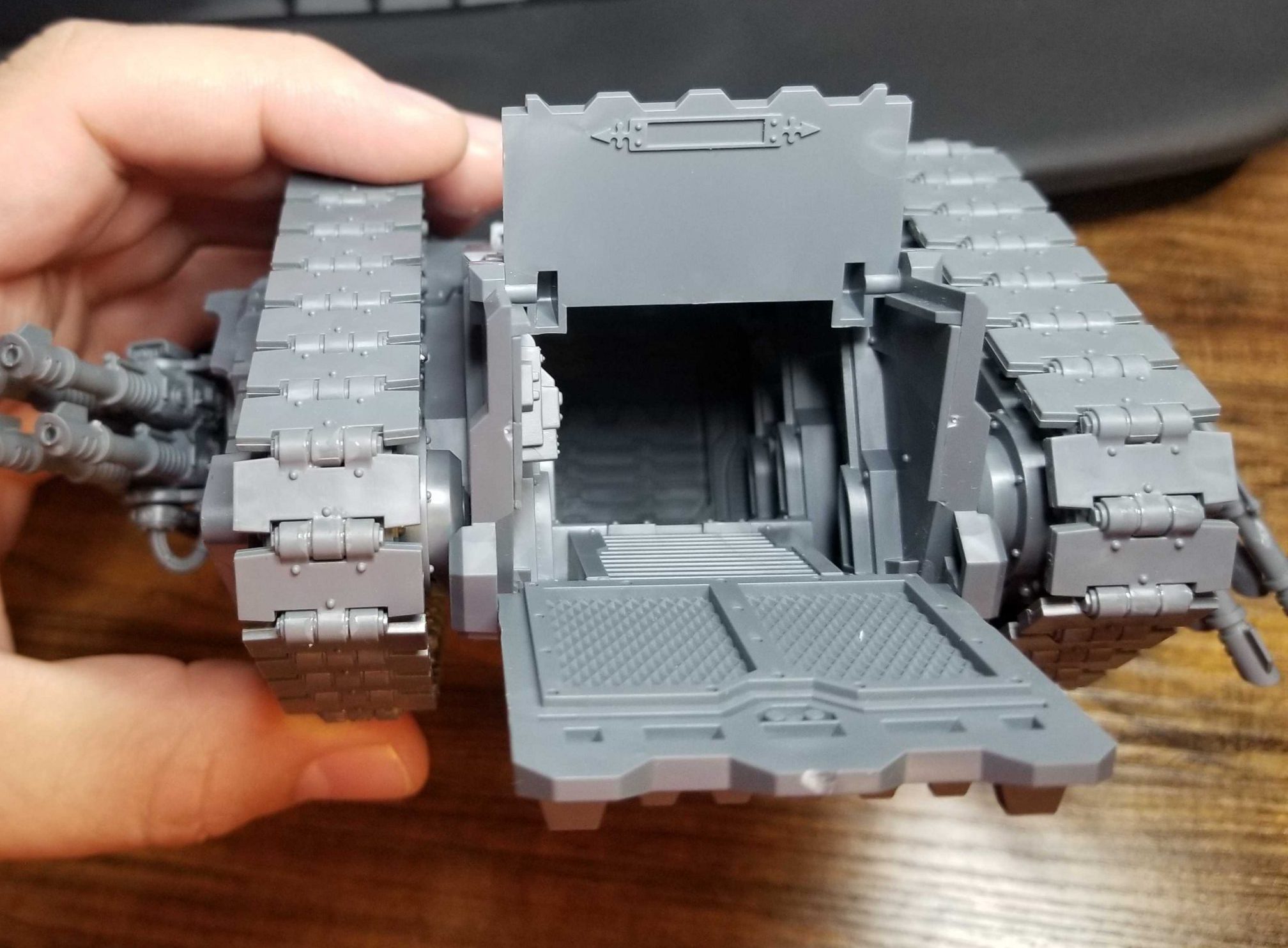 TheChirurgeon: The tank goes together pretty easily, and if you've ever assembled a plastic land raider it's kind of cool to see how 20 years of improvement in sprue and model design come together to make this work. If I have complaints about this, it's that the midsections, particularly the floor, aren't single pieces and that's really awkward to assemble. Otherwise the main body went together nicely. There's some good detail here and without glue or anything fancy you should be able to set up the doors so they open and close, revealing the neat details inside.