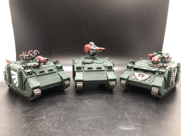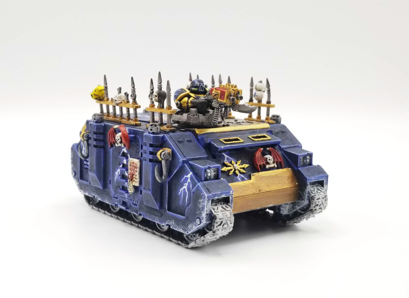 Extremely gorgeous Imperial Fists Rhinos. Credit: Jack HunterRhinos were priced to move in 3rd edition and were a key part of the absolutely meta-dominating rhino-rush strategy. When table quarters mattered and deployment zones were weird thin little things hugging the table sides having the ability to shift your marines around was battle winning. 3rd edition damage tables gave your vehicles a good chance at surviving a round - hitting, then glancing or penetrating was followed by a roll that usually left the vehicle unable to shoot, or losing one of the weapons you'd paid for as ablative armour. Aggressive deployment, a 12" move, 2" to disembark and a 6" charge meant that when your opponent put down a line of rhinos at least a couple would survive to disgorge their cargo with a guaranteed charge right into your lines. When they were filled with Blood Claws - or worse, Death Company (Blood Angels overcharged engines meant that Rhino was coming at you at 18" a turn), that line of Rhinos meant you were absolutely fucked. Even not-at-all-meta 15 year old me understood that the new rhino meant you could do this in style and for a brief, shining moment, my monopose second edition blood angels absolutely fucked. Updating a Space Marine army for the middle and end of 3rd ed was easy: Get as many rhinos as you possibly could.