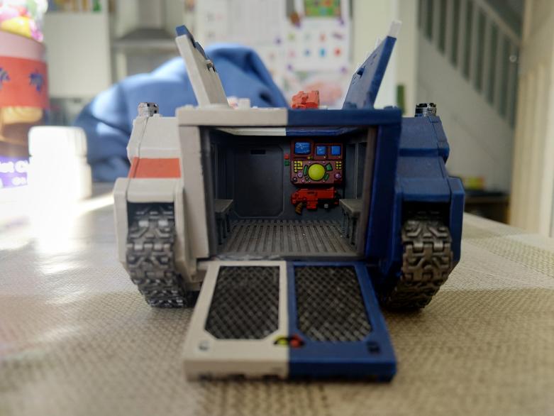 Possibly even painted in 2002, a scary Night Lords chaos rhino Credit: Robert "Chirurgeon" JonesIt was all the extra detail that made it such a great kit at the time. Modelled tracks! Nice Lights! Extra armour! Even the front was a revelation, taking inspiration from one of the classic rhino double panels, modelled this time as thick armour with view ports for the driver (and someone else?) complete with tiny windscreen wipers. The rear of the rhino was totally transformed, with a hatch that can be modelled open, closed and movable. This was a huge step up from the choice of angled armour or flat panels for the rear, and gave the rhino a bit more function as a transport, as well as referencing the land raider. That rear comes with a fully modelled interior, that you can paint and convert, or glue shut to hide your unpainted shame. The sides panels were fully modelled, rather than sculpted-shut weird round doors with a flimsy running rail along the top.