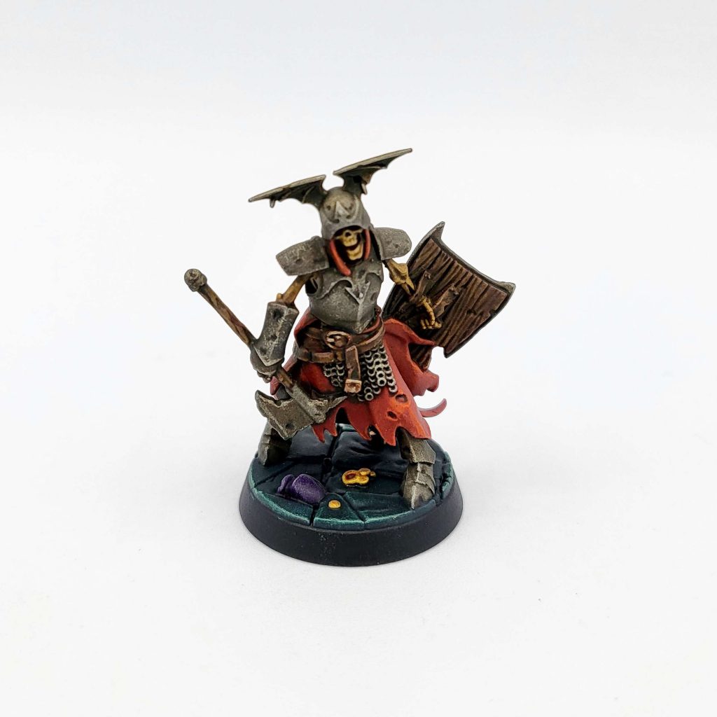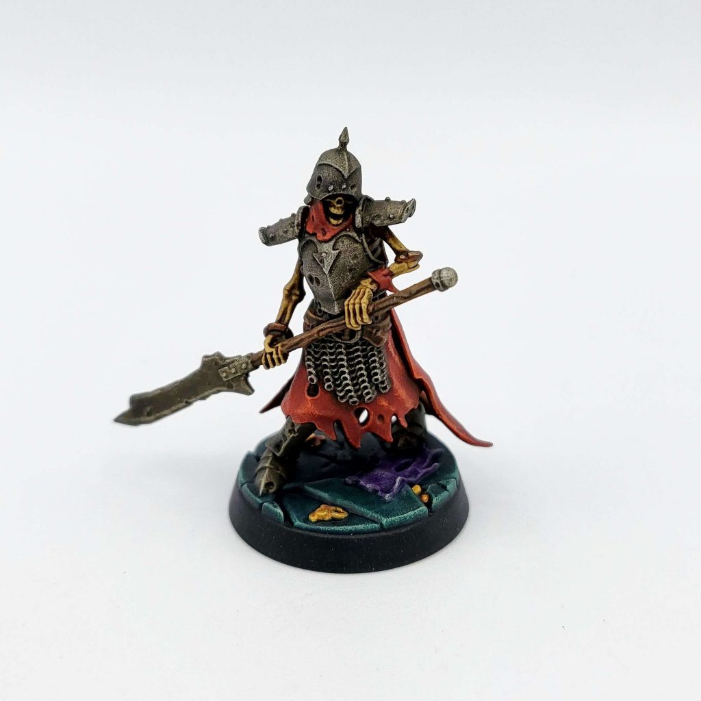 Sons of Velmorn. Credit: FowlerGold details got a basecoat of Army Painter Bright Gold, a wash of Reikland Fleshshade, and a drybrush of Bright Gold. The vase and flag were basecoated with Xereus Purple, washed with Druchii Violet, drybrushed with Genestealer Purple, Lucius Lilac, and the previously mentioned Screaming Skull, and glazed back down with Druchii again. The purple here is a nod to the other wonderful skellies in this article! When I was finished I sealed the model with Vallejo Premium Satin.