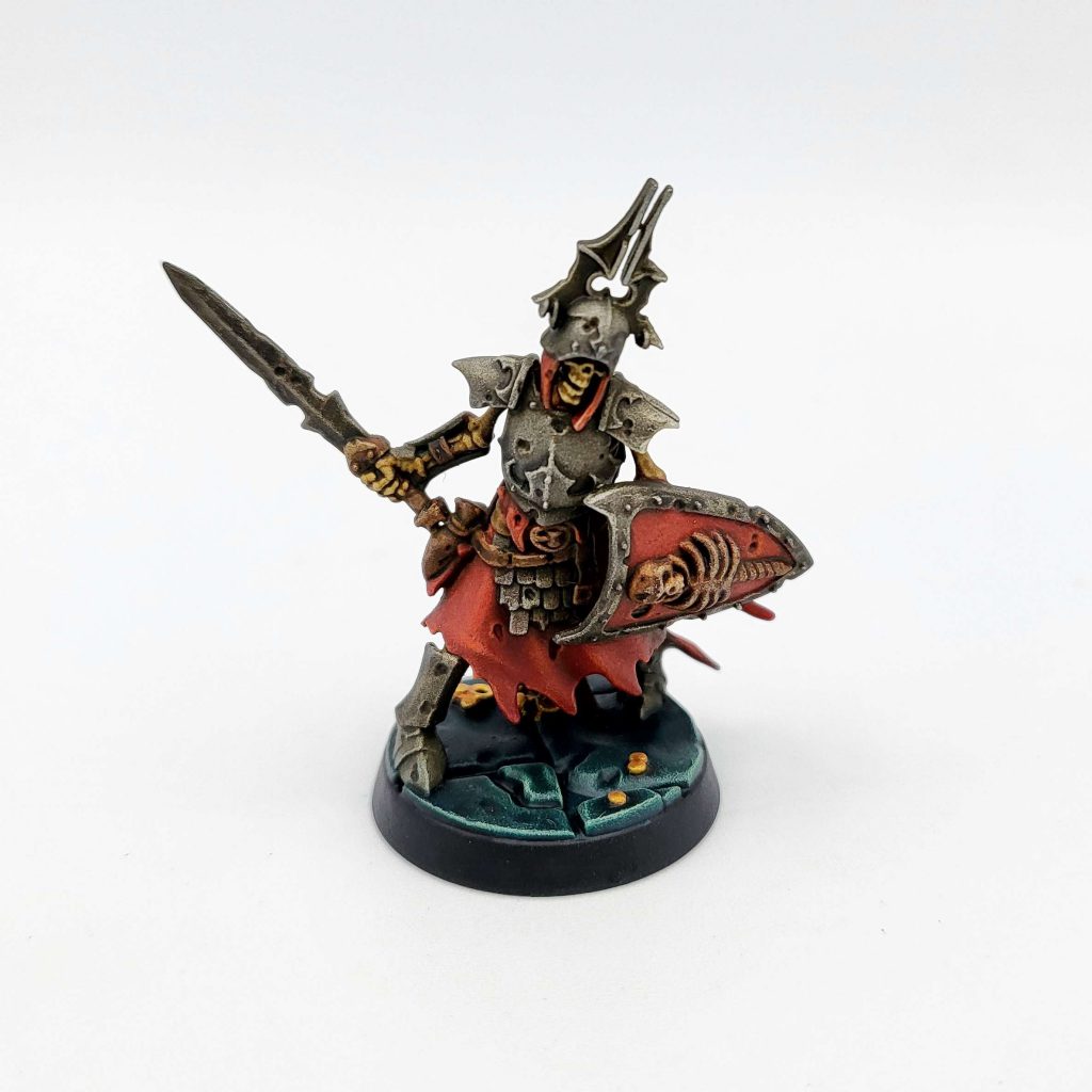 Sons of Velmorn. Credit: FowlerFor bone details, I basecoated Ushabti Bone, washed with 1:2 contrast medium to Skeleton Horde, and highlighted again with Ushabti Bone. I wanted to keep a specific tone and brightness for the bone - think of it as "Harryhausen skeletons from Seventh Voyage of Sinbad played on my childhood tube TV". Steel details get Vallejo Metal Color Gunmetal, washed with Nuln Oil and drybrushed / highlighted with Stormhost silver. On weapon blades, I glazed Nuln Oil a few more times (avoiding the edges) to get the dark metal center I was looking for.