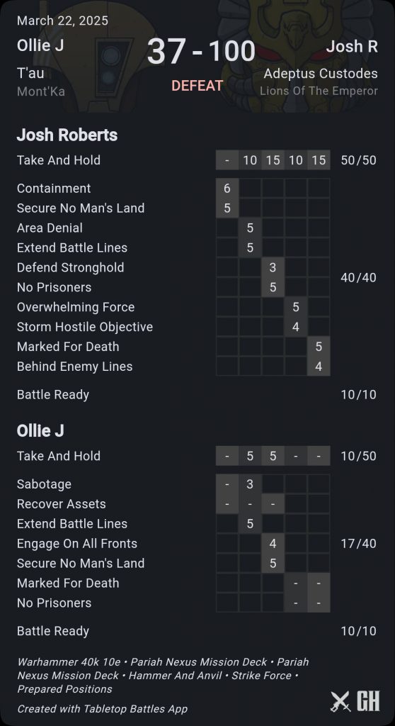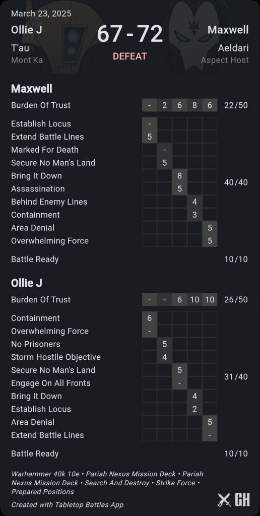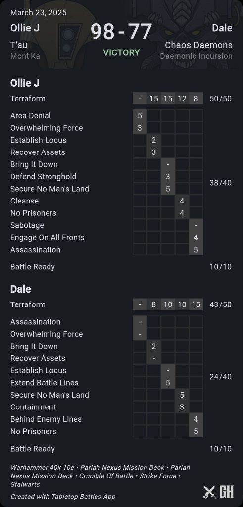 Ben finishes with 77 points, hiding everything as best he can. I finish my Sabotage to start turn 5 with 64 points. I know I will get hold one and more for 8; so it’s down to secondaries and whether I need to make a run at killing Szeras. I pull Extend Battlelines and No Prisoners and decide it’s worth redrawing No Prisoners just in case; and get a very useful Engage on all Fronts. Finally my board dominance pays off and I lock in 9 secondary points to win a nailbiter.