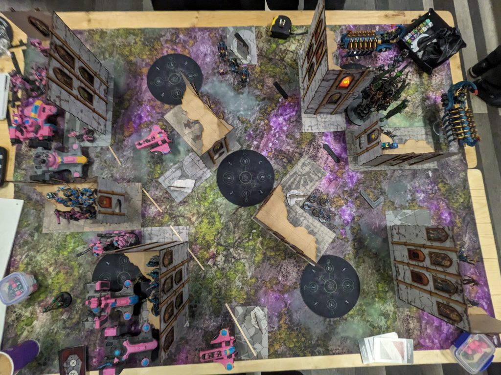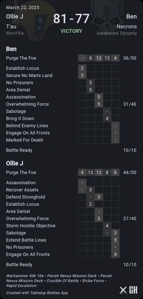 Phew. I was a sweaty mess after this. I think I played this well and would have been more comfortable had the card draws simply been a little different. But that’s how the cookie crumbles with tactical objectives. We had a chat after and agreed that Ben had been too respectful of my shooting. His Lychguard with Imhotek spent all game sitting in his home when he could have used them as a threat saturation element as part of his turn 3 push. But I had intimidated him with the ease by which I was picking up his DDAs and C’Tan and he never used a very expensive chunk of his army.