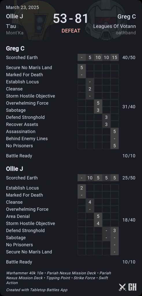 It’s all over now bar the shouting. I get a better set of secondary cards to finish the game, getting to max Area Denial, Secure No Man’s Land, Behind Enemy Lines and Engage on All Fronts and picking up 8 and 13 Primary over 4 and 5. Tom does manage to ensconce enough OC, all tagged up in fights to keep the bottom right objective and score some strong secondaries to finish but it’s a clear T’au win to start.