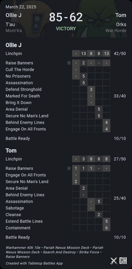 Tom was kind enough to describe this as “a humbling” - really I think he had never encountered Mont’ka T’au; and had not teched enough for a ‘jail mirror’ - a single unit of Kommandos would have saved him a lot of bother in this specific game though I appreciate Ork list building is always a real balancing act of ‘stuff wot can kill fingz’ and ‘stuff wot grabs good bitz’. If I simply don’t get the first turn here, it’s a way harder game but I had enough screens that I think I could have baited out a Waaagh and still punched back very hard. My list fundamentally relies on volume of decent quality shooting in a way that a 5+ invuln, while being better than a poke in the eye with a sharp stick, doesn’t always matter that much against (e.g. Nobz with a 4+ save against all my AP-1).