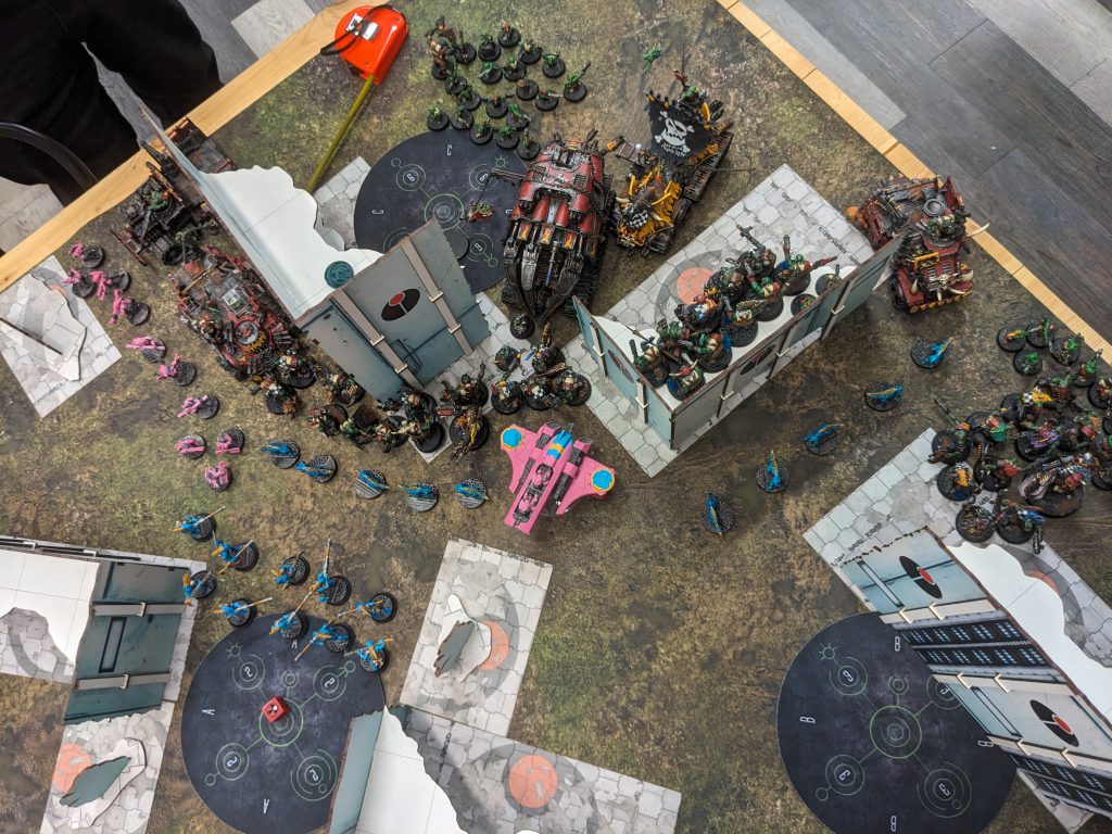 Tom is in a very bad spot now. The Grotz bottom right manage to not only charge the Breachers but pile in enough to successfully tie OC on that objective and the Flash Gitz in the centre slam into the Broadsides sitting centrally as well. But then a succession of 9” and 10” charges completely whiff - Beast Boyz into Crisis suits, Breaka Boyz into Hammerhead, second Flash Gitz into Broadsides and Boyz into Broadsides. Some of those are more impactful than others but collectively it’s no bueno for the green team. The Breachers and Grotz engage in a meaningless slap fight while the Flash Gitz drag down one Broadside.