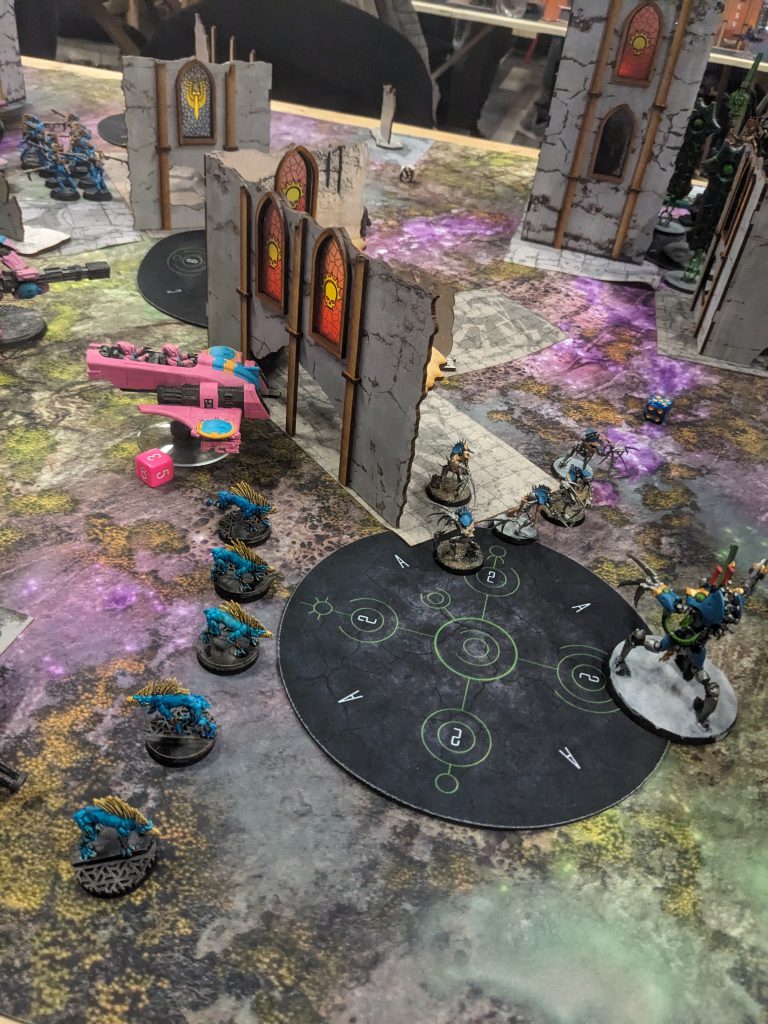 Reader, I had not screened well. Max was spooked by my SMS barrage killing 3 Warp Spiders and decided to full send. Thanks to trying to prevent both flying Warp Spiders and footslogging Howling Banshees from getting into my lines, I managed to fail at both jobs by fairly slim margins. So Lhykis tied up a Hammerhead and two Broadsides, a unit of Banshees got in and killed a Stealth team and tagged the other Hammerhead and a unit of Breachers (disembarked from a blown up Devilfish). Jain Zar and her 10 Banshees killed the Pathfinders and stood on my top left objective. I dropped the Crisis team into my castle in rapid ingress to try to fortify and push back but I was underwater in a big way.