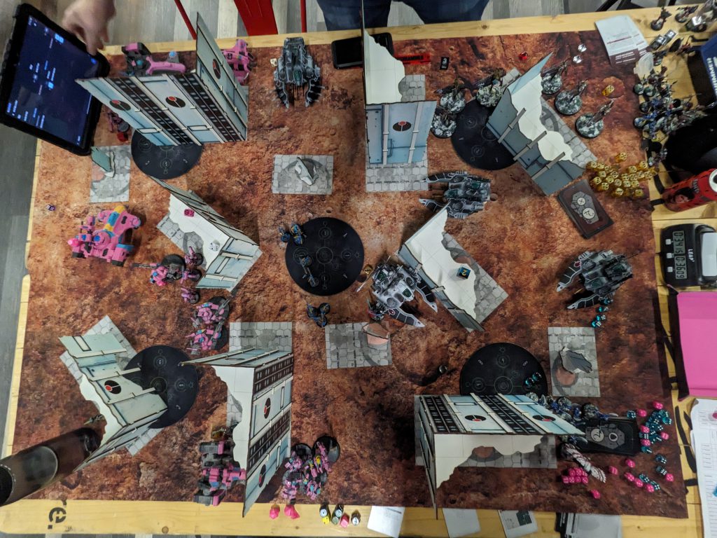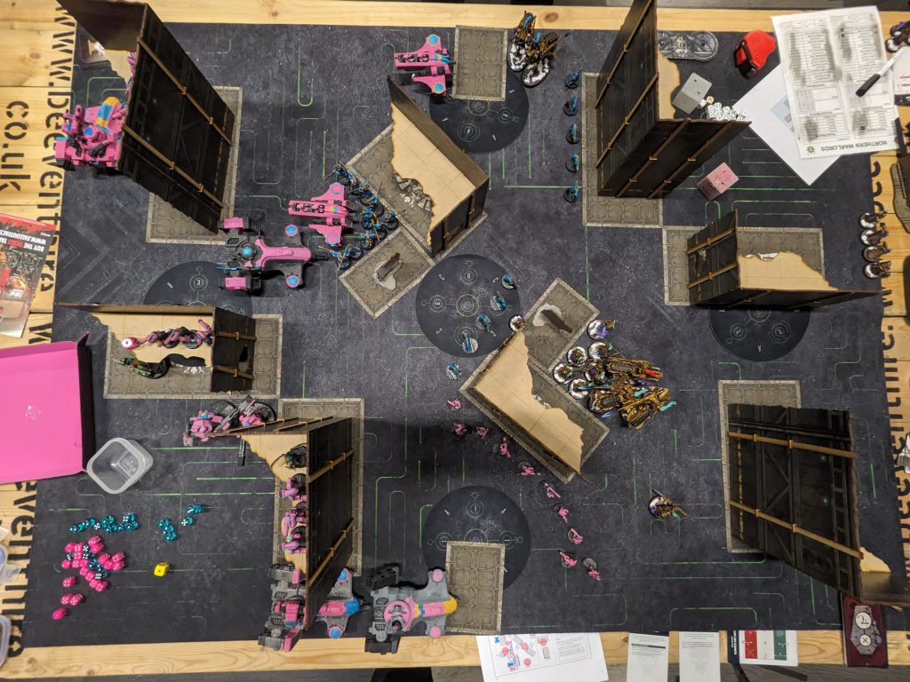 I was originally paired into an AdMech list which would have been another very new and unfamiliar game for me, but a few drops meant a last minute re-pair into Greg. So the reward for taking on and losing to Josh Roberts in round 3 is somehow to pair into one of the UK’s most consistent top 10 players of the last few years? Cool cool cool cool cool cool. Fortunately, I knew Greg from round 1 at Northampton last year and he’s a pleasure to spend time with. Votann are tough to chew through but he’s not running the Yaegirs so I should be able to dominate mid board deployment and if I get turn 1, push very hard into him to try to slow him down.I deploy with all my dual resources split across my flanks, Devilfish on the outer flanks, Hammerheads on the inner flanks. The Hounds and Shaper sit near my home and the Crisis team is in the sky.