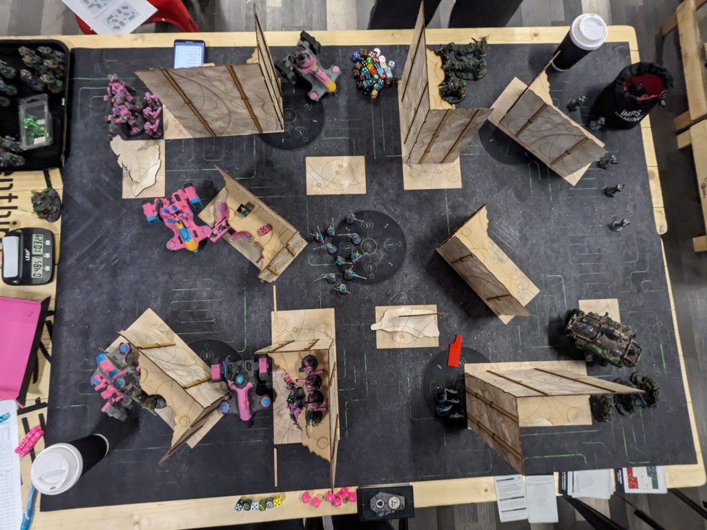 Round 6 is always a challenge. I was feeling pretty decent but I knew that was an illusion and the fatigue and drifting focus would come into play. Unfortunately, I was paired into Aeldari having only had a single previous game into the new codex and that a different detachment. So I was woefully unfamiliar with key things like threat ranges, likely output and defensive profiles. Put a pin in that, we’ll come back to it. Fortunately, I had packed plenty of SMS and volume AP-1 shooting which I understand elves of all sorts hate.The mission is also a bit of a problem in that I don’t like it and I don’t like search and destroy on this GW layout. It’s really hard to get across this map to project threat onto the bottom right objective and the firing lanes are actually quite constrained in many ways while still having few places to hide early on. I had a vague plan if going first which was to try to pressure the Aeldari into a mid-field brawl that I thought I could win; and if I go second I think I just try to disrupt primary and hold out for a late game primary swing.