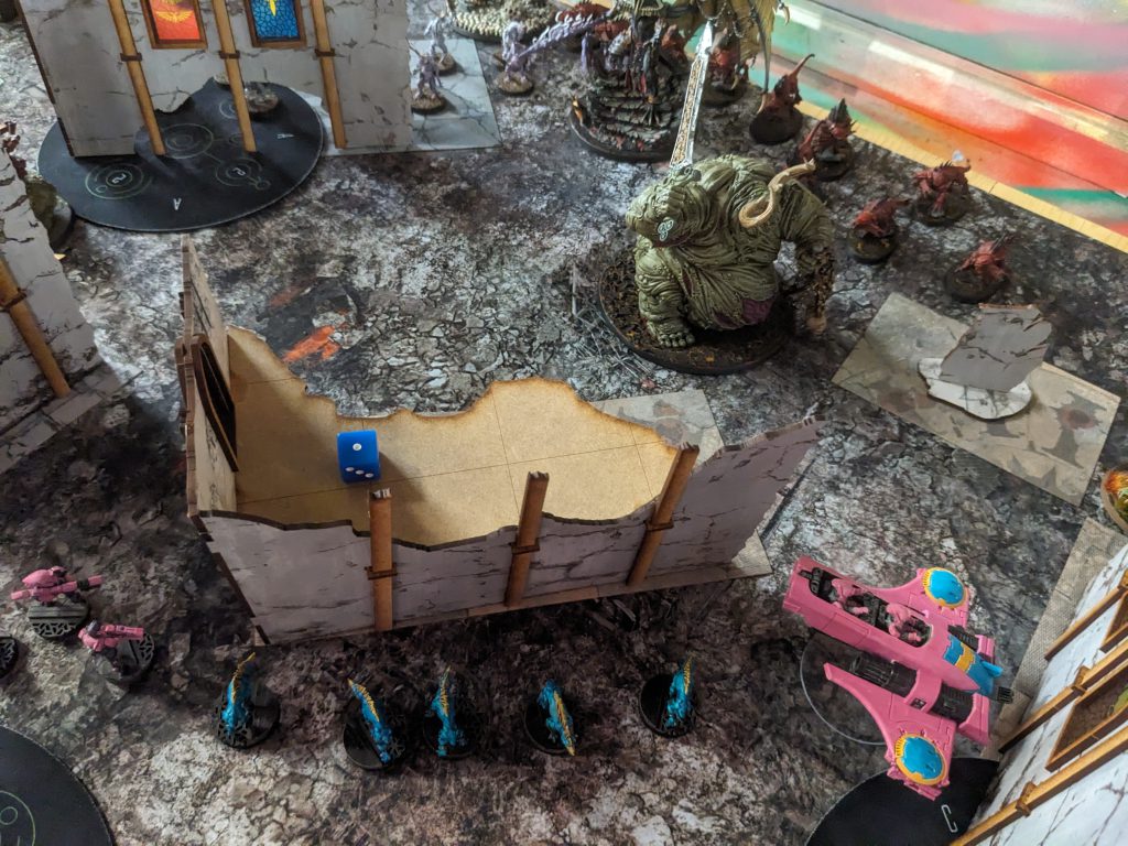 I know if I go first, I can guarantee two terraforms and have a decent chance of sneaking a third. So camped on my line from centre bottom up to the top are: Piranha, Devilfish, Hounds, Hounds, Carnivores, Piranha, Devilfish. My Pathfinders were up around the top left objective, Broadsides and Hammerheads sitting each near the horizontal firing lanes towards the centre and my Krootox Rider screening the backfield. Dale is obviously both slightly scared of my shooting aggression and willing to lean on his uppy-downy so puts a Bloodthirster and Bloodletters in reserves and otherwise deploys fairly deep into his zone with just the Blue Horrors infiltrating on the bottom right objective tucked into the ruin.