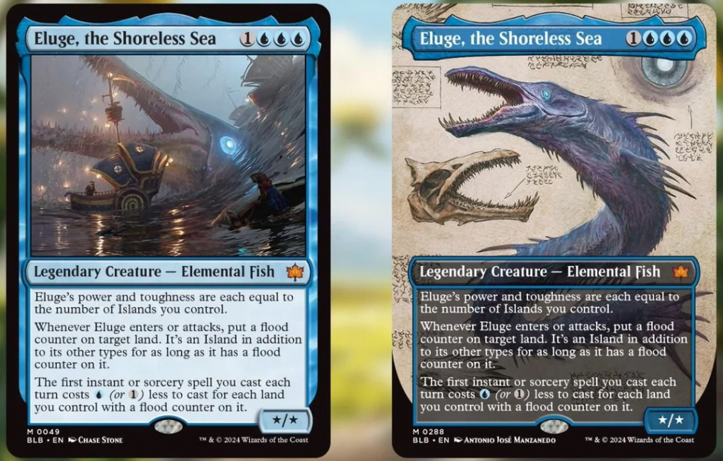 Difficult to tell who my Commander is, yeah?I could go on about Eluge forever — it truly is the first Commander since Baldur's Gate to get my blood pumping, and mind brewing. It helps that the art's fantastic, and there's a shocking number of Eluge merch options available, finally giving me a worthwhile Magic-themed shirt to wear at FNM. Further still, the fact that Eluge is a Fish (a gar, specifically), as opposed to a Serpent or Kraken tugs at my heart strings, as my college thesis hinged on palaeoichthyology, quite literally the study of placoderms in the late Silurian. A Monoblue Fish Commander that gets to play table cop feels like it was made for me, but thankfully, Eluge has attracted a great number of players across the power spectrum! As mentioned, it's nearly a Top 10 Monoblue Commander on EDHREC, and the Eluge-specific Discord has over 200 members, on top of the Fish seeing curious control pilots peck at its potential for cEDH in an era of midrange. You can quite literally do anything with Eluge in Blue, and likely see some form of results.