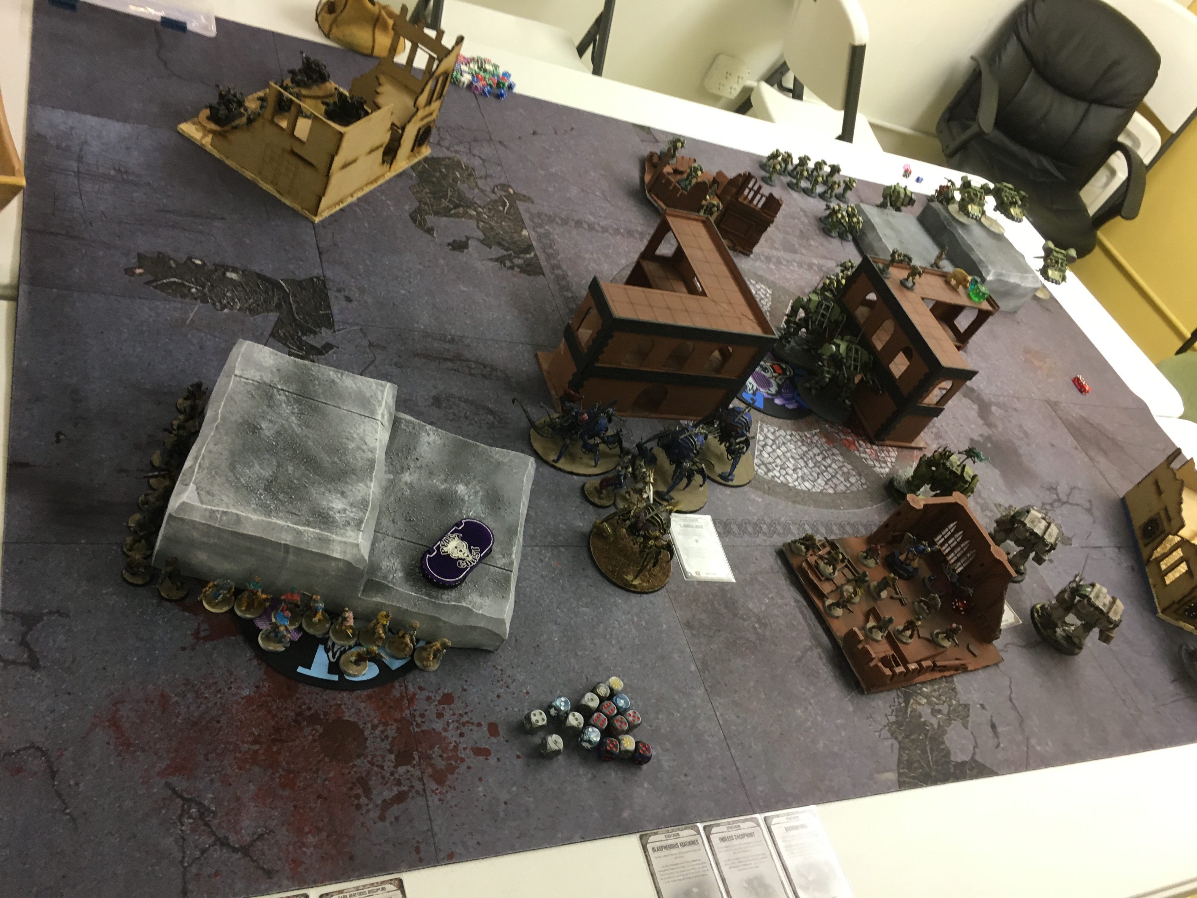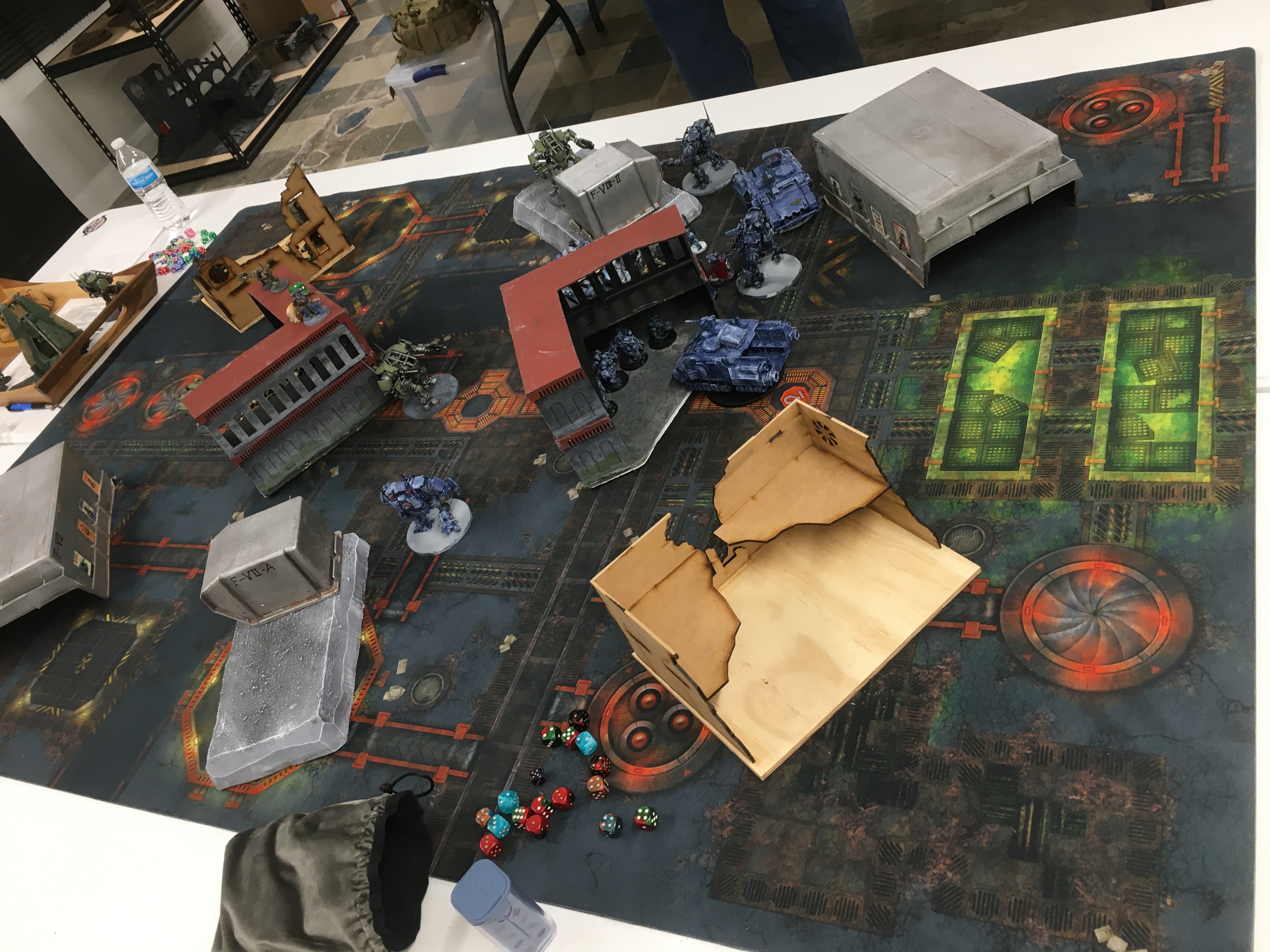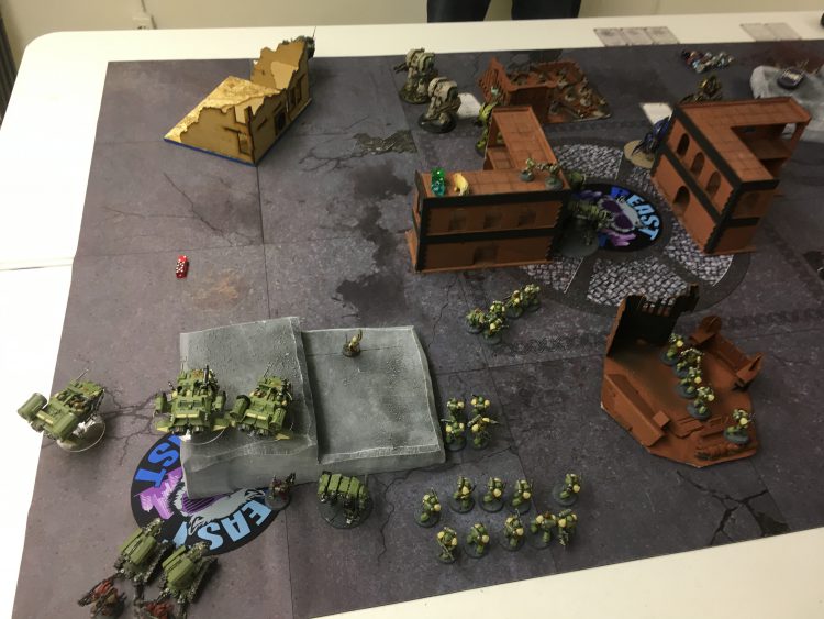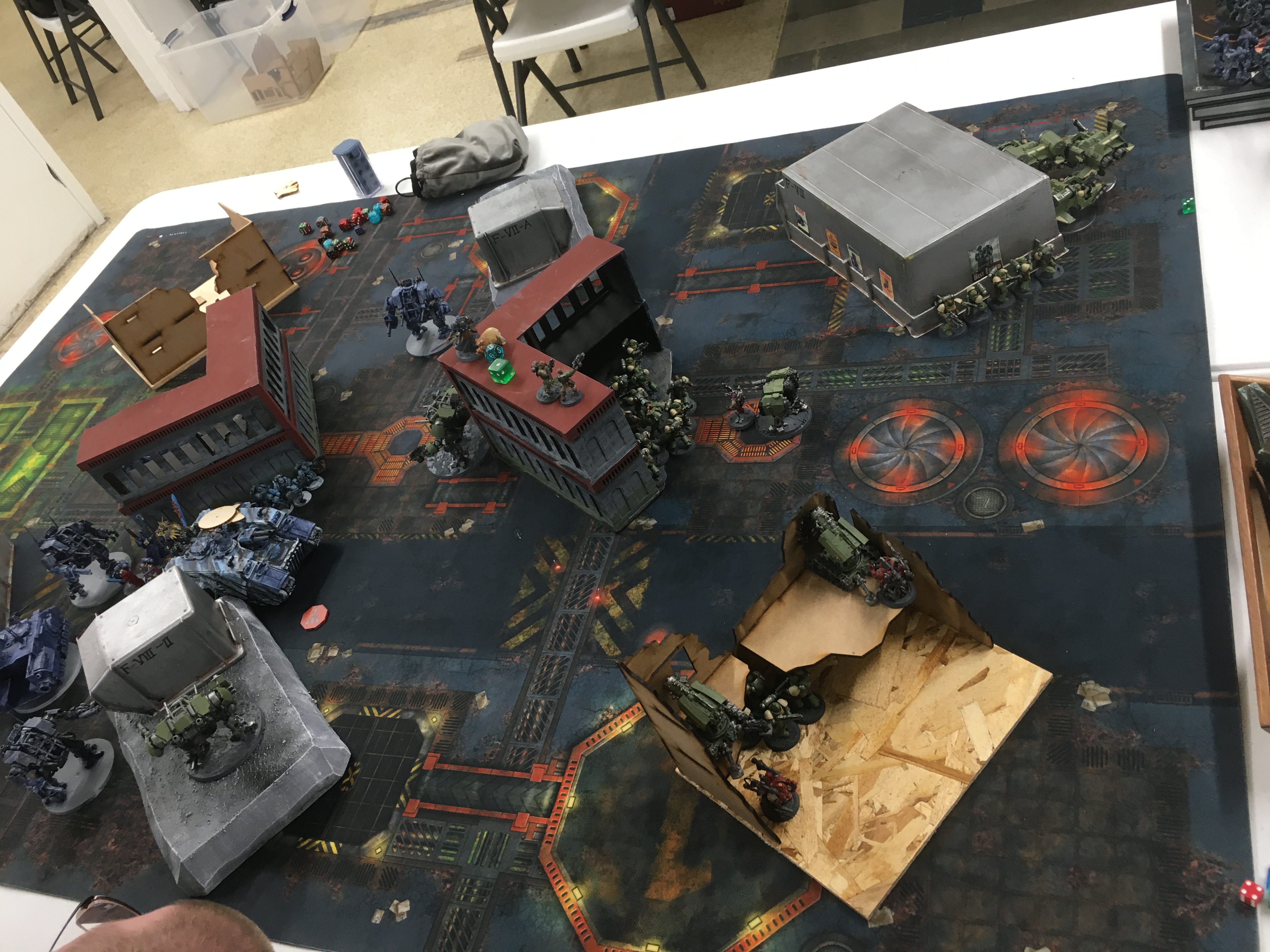 I won first drop and took the middle with my first Invictor. After that we did our alternating thing, him with on Invictor on my right, and the rest of the deathball on my left or behind the L blocker. My stuff was mainly in the bottom center, with the speeders to the right behind a huge square impassable building. I tried to seize since the Invictor trades would be important and failed.