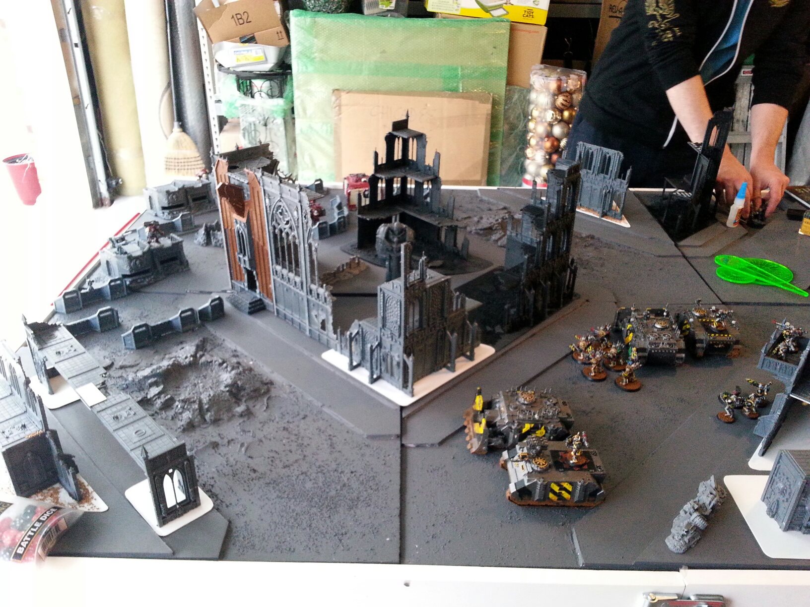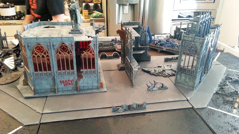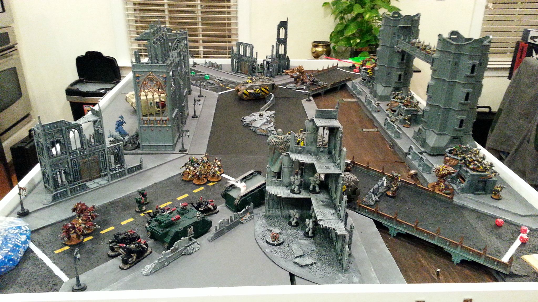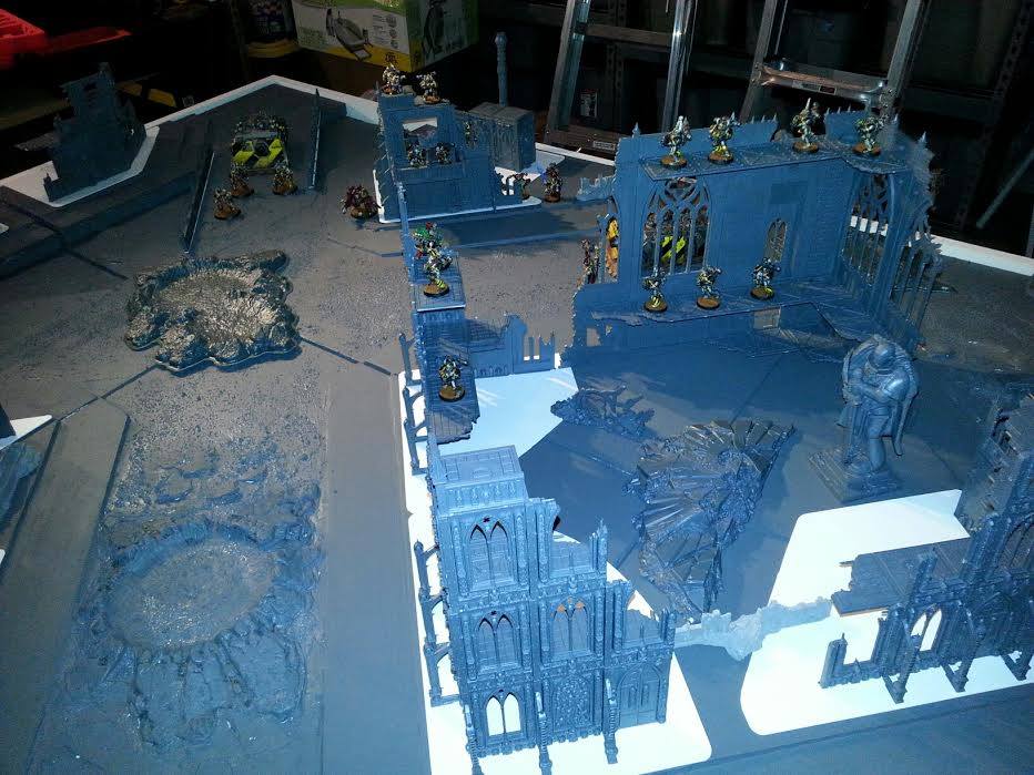 This led to more games almost immediately, which, when the terrain was painted, led to some killer photos. This photo also shows off how we designed terrain bases and features for different parts of the table, with triangular bases and flat walls for the corners, and corner sections for the middle to give us a big center skyscraper.