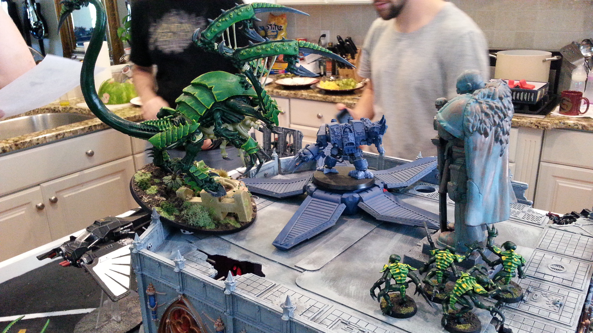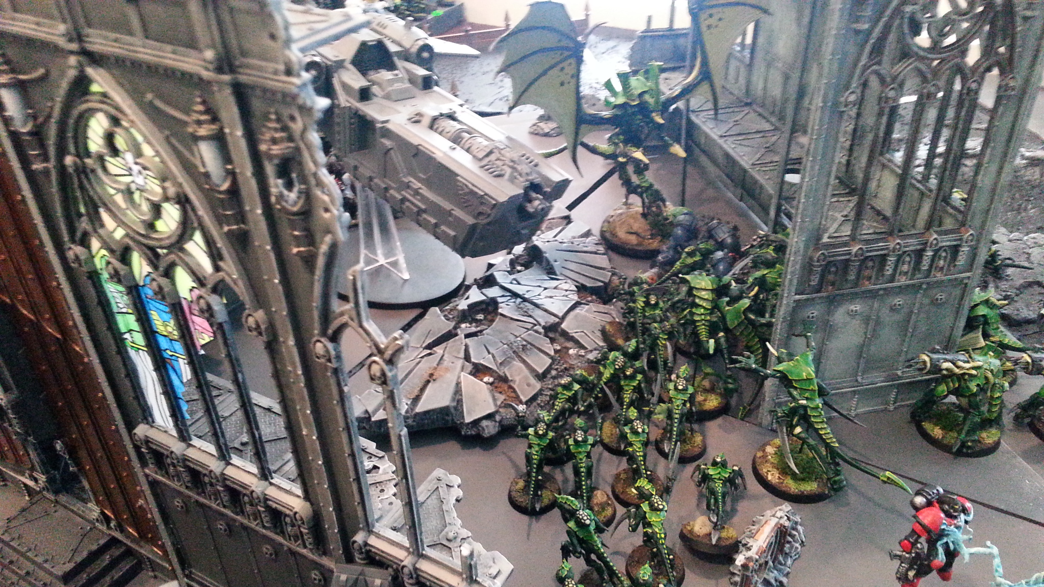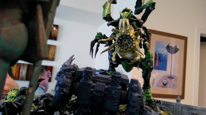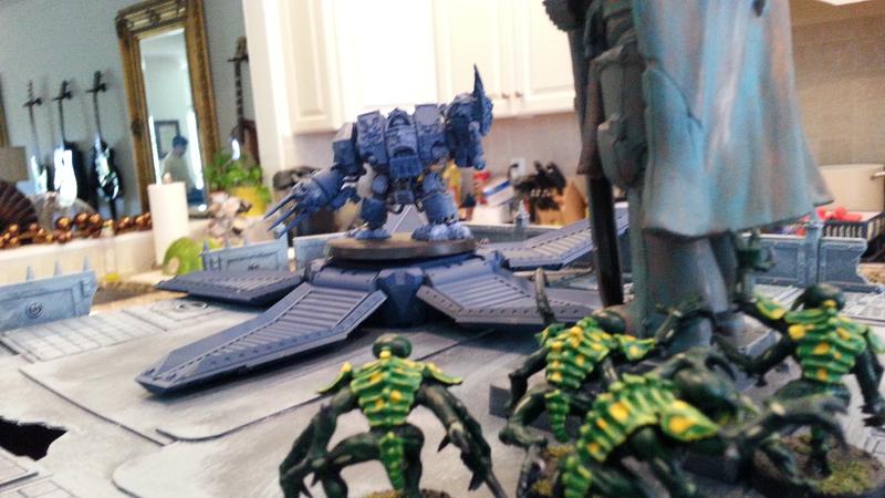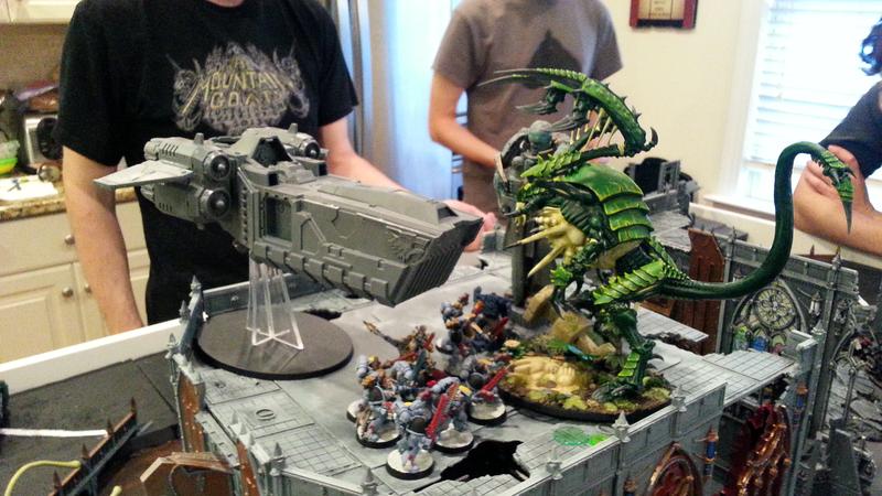It worked. Midway through the game, BuffaloChicken's genestealers infiltrated to the top of the building, hoping to hold the statue objective. Seeing an opportunity to defend, SD47 used his drop pod to deploy Murderfang on the top of the building.