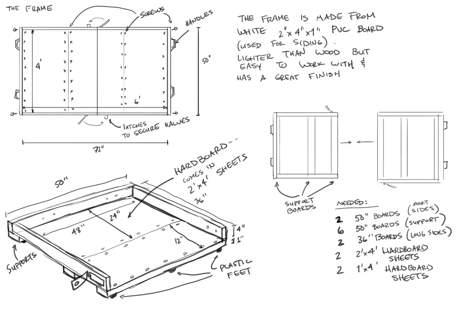 The Frame was the toughest part. I need something I could break down easily into more manageable chunks, so having it be assembled in two halves seemed like the right choice. It would need to accommodate a 6x4 table inside, which meant if I was building the frame out of 2x4 boards, it would have to be 74" (72" + 1" on either side) long, and 50" wide. Because one set would sit inside the other, I used 72" boards on the long sides and cut the short sides to 52". I also needed support underneath, to hold the boards in place. Then I could screw 1/8" sheets of MDF into the boards to create an interior floor to set boards in. Finally, I needed the sides to latch together. I ended up installing latches on both sides of the table frame so I could secure the whole thing together.