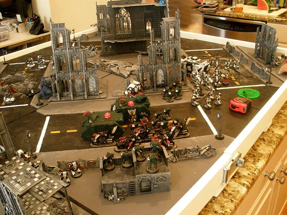 Shortly after I got married, my wife and I moved to New York. We met as undergrads in college, and after we got married decided that we didn't want to live in the Baltimore area any more and moved to New York, leaving most of our college friends behind in order to not live in Baltimore anymore. I haven't regretted doing this, but it did make things tougher for a little while. People we had gotten used to seeing every day or every week were suddenly more than three hours away and likely to be people we saw once or twice a year, if that. So I decided that one way I'd work to bridge the gap was with games. Some of this was weeknight Xbox Live gaming, and some of it was Warhammer 40k. My forever bro Greg "Greg" Chiasson was already into 40k, owning more Dark Angels than any human should ever be allowed to, and we convinced his now-longtime rival SD47 to join as well. Greg had set up a table in his basement, and we gamed there a couple of times. The problem was that we couldn't stay at Greg's house and four hours is too far to travel for a game of 40k, especially if you are traveling with your spouse.