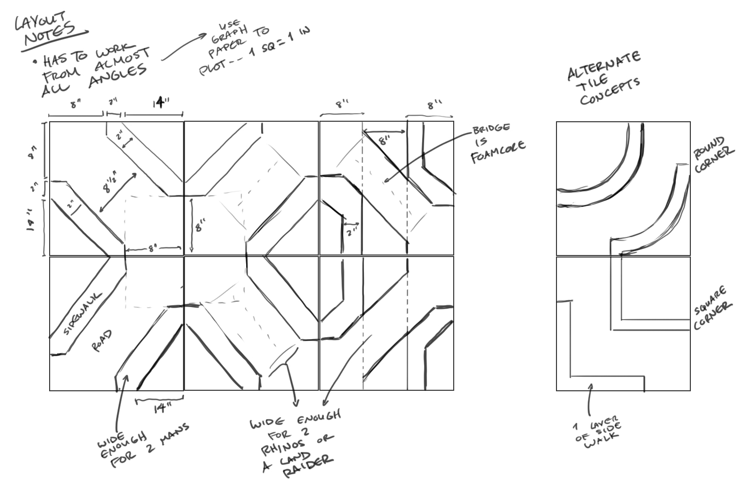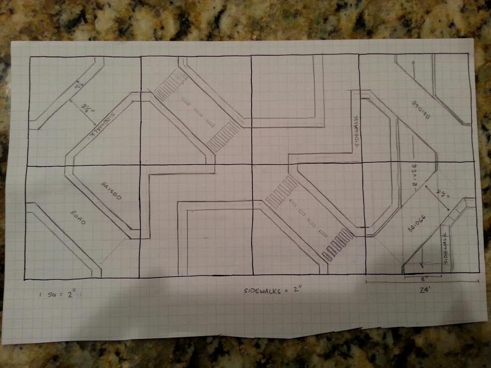 Next up: Planning the terrain layout. I wanted modular streets and sidewalks. I knew that. The problem was, how do I make the streets fit together in a way that wasn't boring and led to good table layouts? I considered a few different options, but in the end went with a diagonal road design that would allow me to create full city blocks while also having lots of long roads that made sense from a city planning and layout standpoint. I planned several tile types on graph paper beforehand, including the river and bridge tiles. My initial plan called for 8 tiles, though I built only 6 on the first pass (more on that later).