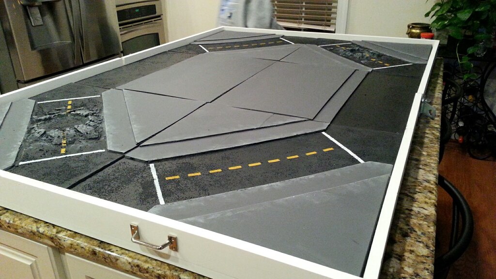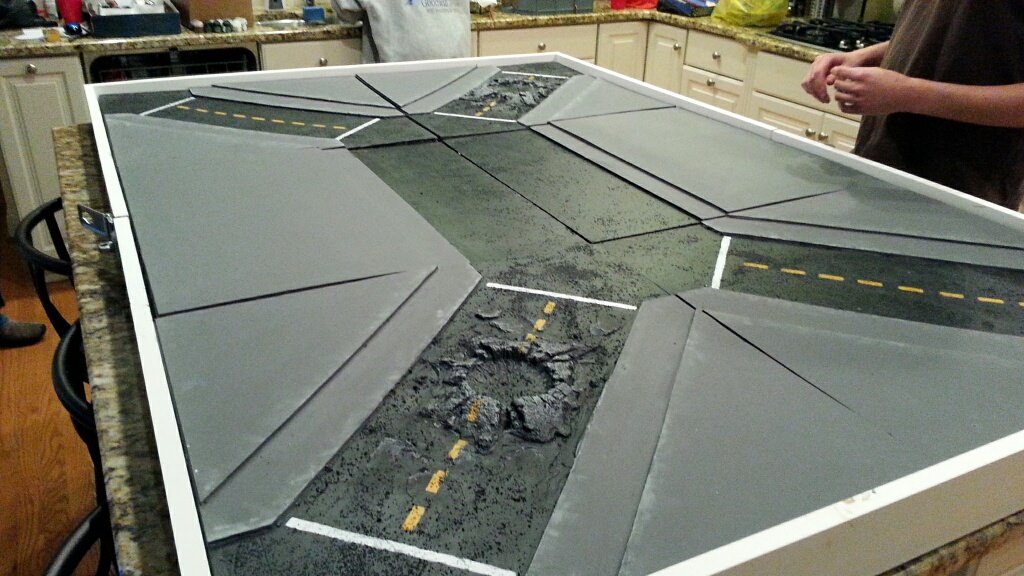 - What kind of terrain will I need to build for it? How are you going to cover the thing once it's built? What kind of terrain do you need to place on it, and how will you build it? Thinking about this in advance is important to making sure that your table and terrain come together cohesively. For example, I was building a city board, which meant that I'd be building a lot of tall, multi-story buildings that would need wide, "sidewalk-like" spaces for them to sit on, and roads between them where I'd want to be able to place barricades or craters.