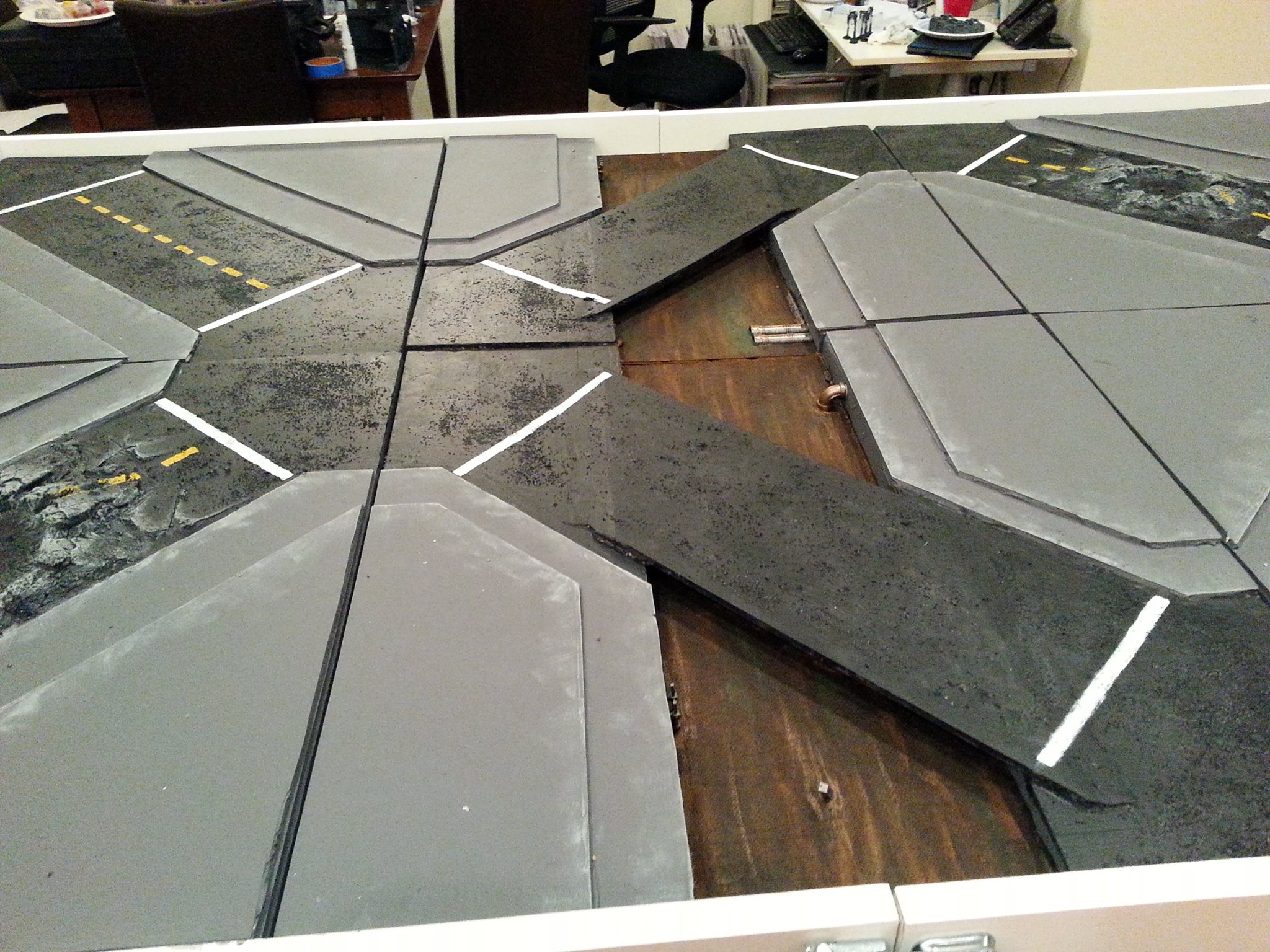 I used drywall spackle to both blend the craters into the streets and add some texture to the river, then I used foamcore board to make the bridges. I had a plan to dress them up later, but this is as tall as they could be if I wanted my tiles to stack well. You may notice some gaps in the table already. Yeah, I noticed those too. Because I used two sheets of foam and because of the temperature, some of the tiles warped pretty badly overnight, and some of the fits weren't ideal. I'd fix this later on.