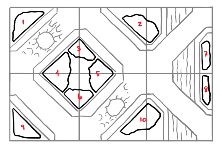 Terrain-wise, my layout had certain implications. I wanted to be able to fit something on each sidewalk section, so I needed to have terrain to match. I didn't have to base the terrain, but it'd help smooth over the cracks between tiles and in my experience, it's just good practice. It also future-proofed the table for 8th edition well. I'd need 4 large corner ruins, 2 smaller corner ruins that could fit in the less-full sections by the bridges, two triangle sections, and two smaller, flatter pieces for the opposite side of the river.