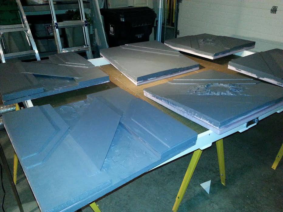 Flash forward another five months to October. We've been regularly playing games and at this point I'm ready to try some new things with the table. After all, I've still got all the old materials I used to build the table. I decide to add three more tiles: Two that will allow me to create a single massive center island, and a third that will let me extend the river the length of the table. These are pretty easy - I use the same technique as before and just match up the new sidewalks. Each tile only takes an hour to make, then it has to sit overnight with the clamps.