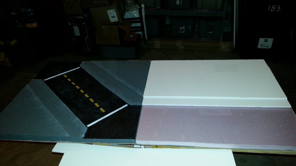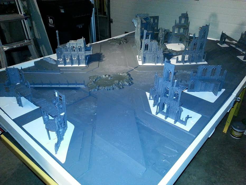 I was able to find a bunch of 2'x2' insulation foam tiles at the local Lowe's, which sped up the task quite a bit, and from there I used PVA glue to make the tiles, gluing together two 2x2' foam sheets using PVA glue (note: this was a mistake - I should have attached them to sheets of MDF as well, for more support and to stop them from warping). I then cut foamcore board and glued that on top of the tiles to create the sidewalks and used a mix of PVA glue and water to seal the edges of the foamcore and coat the tiles to seal them and allow me to spraypaint them. I had the local hardware store mix me up a can of gray paint color-matched to Astrogranite, the texture paint I use for most of my bases. NOTE: It is very important that when you build your table, it matches your primary army's bases. This gives them home field advantage, and there's nothing cooler than when your minis look like they match the table and all its terrain.