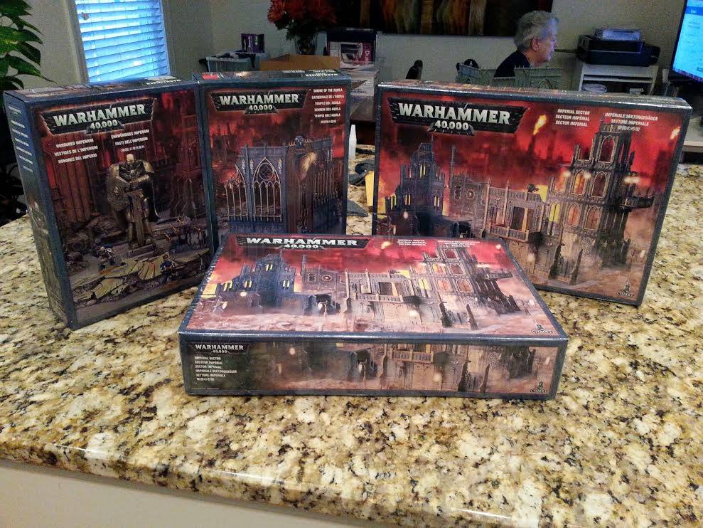 I've always loved urban combat in 40k tables. Towering buildings, dense streets, claustrophobic alleyways -- there's something that's just so freaking cool about fighting in the downtown of a ruined city. So that's what I wanted to go with for my board. I also wanted to do some kind of river or water feature -- I love it when terrain matters in a game, when players have to figure out how to use a key terrain feature to their advantage, or work around a disadvantageous one. So I wanted to have a river of some kind as well. That would also need bridges at some point. And I'd have to build the terrain to cover the table once it was complete -- which would mean a lot of Sector Imperialis buildings.