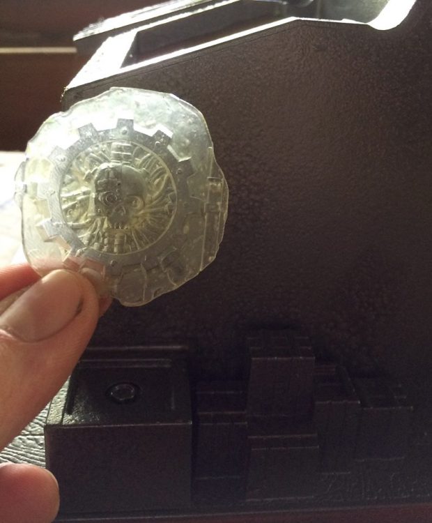 Turn any old toy into a genuine 40k terrain piece with a tasteful smattering of skulls and cogs. This stamp mold was pulled off a Cities of Death building.