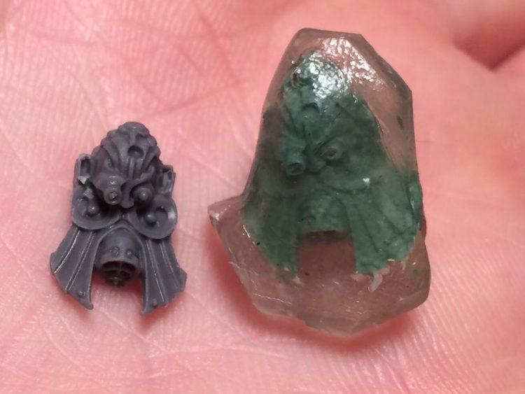 This shows the original bit (left) and recast bit (right) after painting. The left of detail is almost identical. Also note that the original model is entirely unharmed - despite being painted with water-based acrylic paints and not sealed at all, the entire recasting process left no damage or residue on the original. Also, now that you have the mold, you can re-use it as many times as you want! When you don't need it any more, simply toss it back in hot water and use it for a new project.