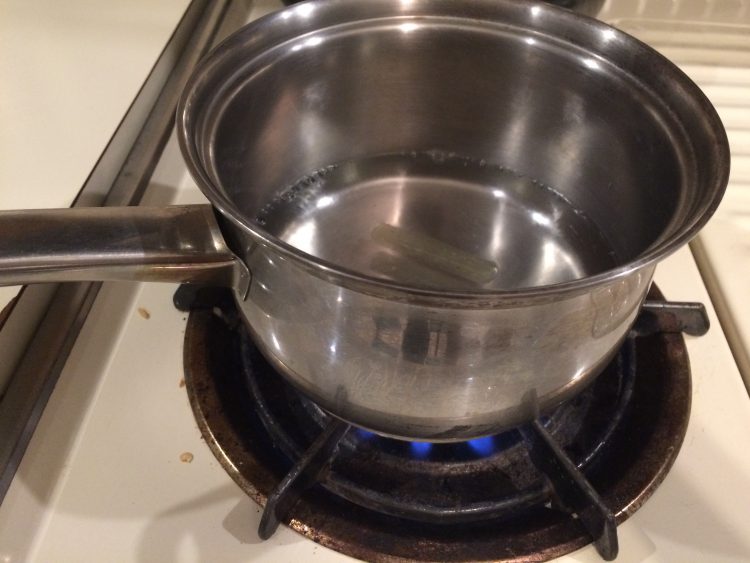 Just wait for the water to start bubbling, and toss the Instant Mold in. Let it bob around for 20 seconds, then scoop it out with a spoon or tongs. Squish it around - if it still has hard parts, flatten it and toss it back in for another 20 seconds. Repeat as necessary until it's uniformly pliable.
