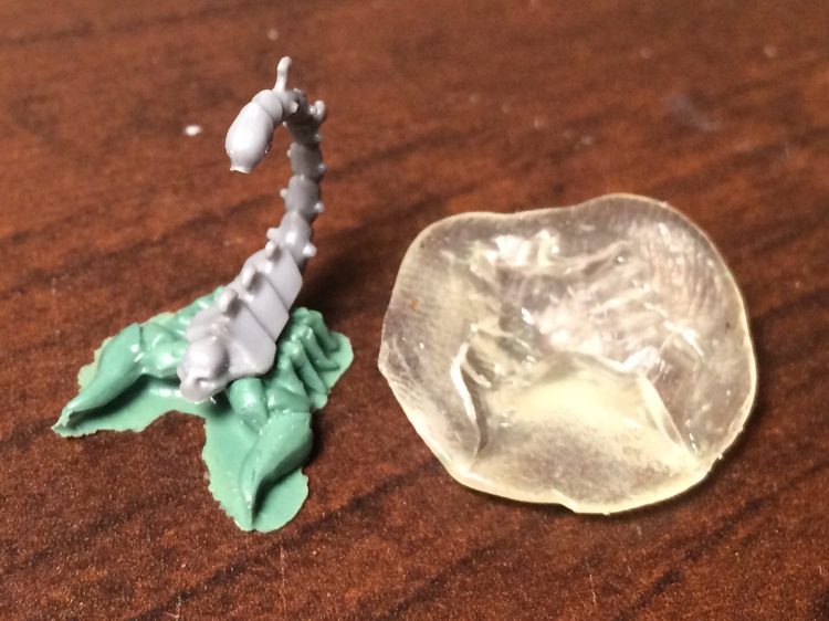 I only had a single pair of legs for two scorpion upper-halves, so used a simple stamp mold to replicate the legs. Now this lil' buddy is ready to terrorize a Deathworld Forest terrain piece or model base!