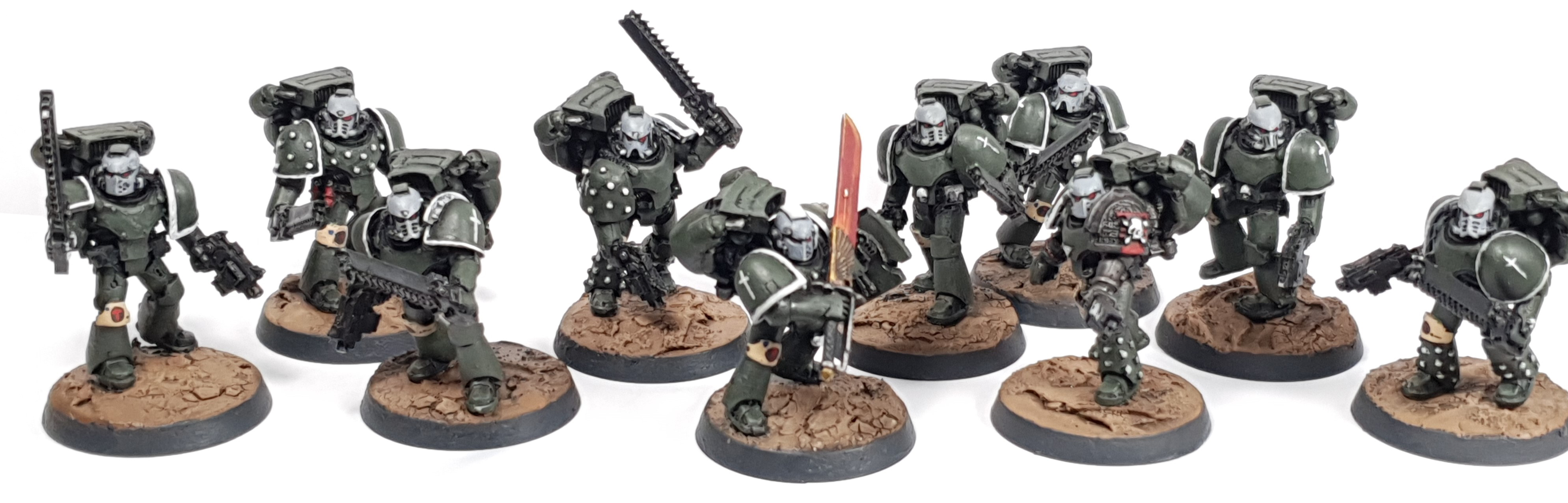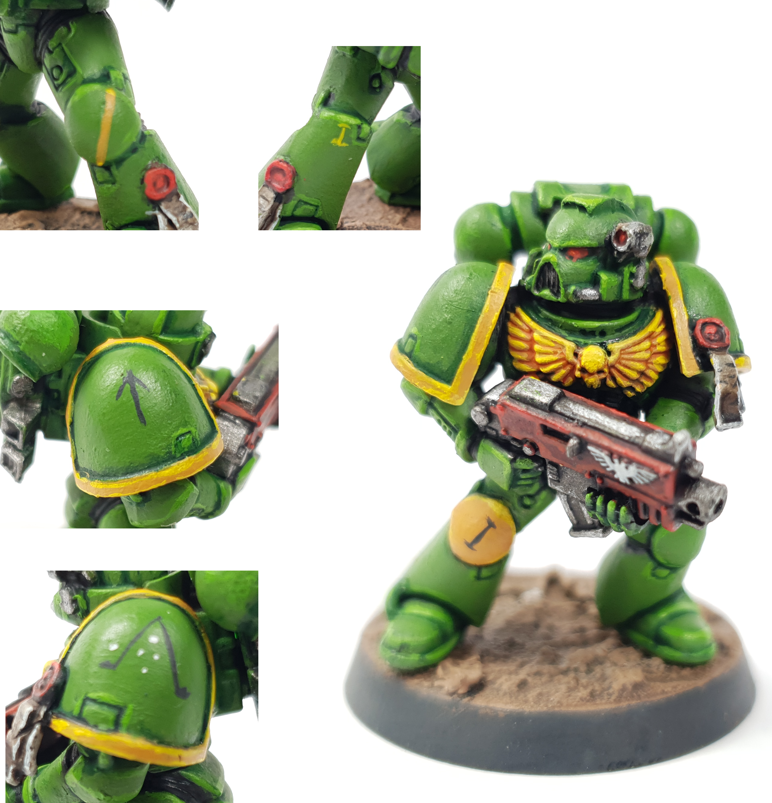 So I put my thinking cap on and painted up a number of test models, trying out various trim colours of red, black and grey, while also exploring the new Primaris sculpts. White ended up being forerunner, I also found that the distinctive crest/ears part of the helm could be picked out in white to get a call back to ancient troops, like roman legionaries or knight's crests. I also started figuring out how to show what company the troops came from and where squad markings would be present. Given that the white helm/trim really made the green 'pop' I needed to keep that in, so therefore I went with the right knee pad. I also spent time figuring out how to show squad leaders, veterans and the like and turned to the codex for ideas. I ended up coming up with a quick system based on the helms.