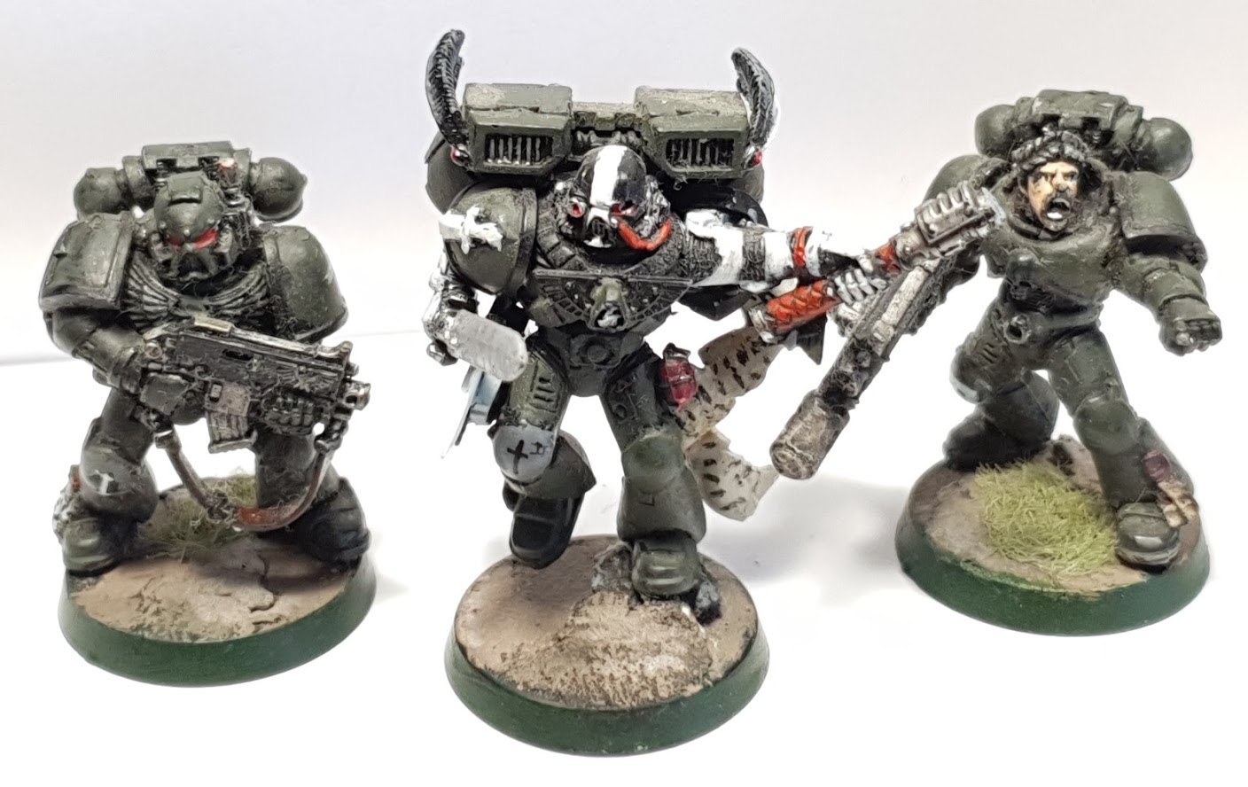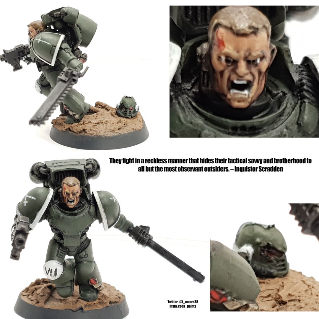 Painted by Tyler "Coda" MooreCompare the two pictures and try to ignore the (hopefully) vast improvement in painting. See how the black grey/greens are all blurring together compared with white trim details on the marines above? This is something that I wanted to avoid on the MKII version of the Swords.