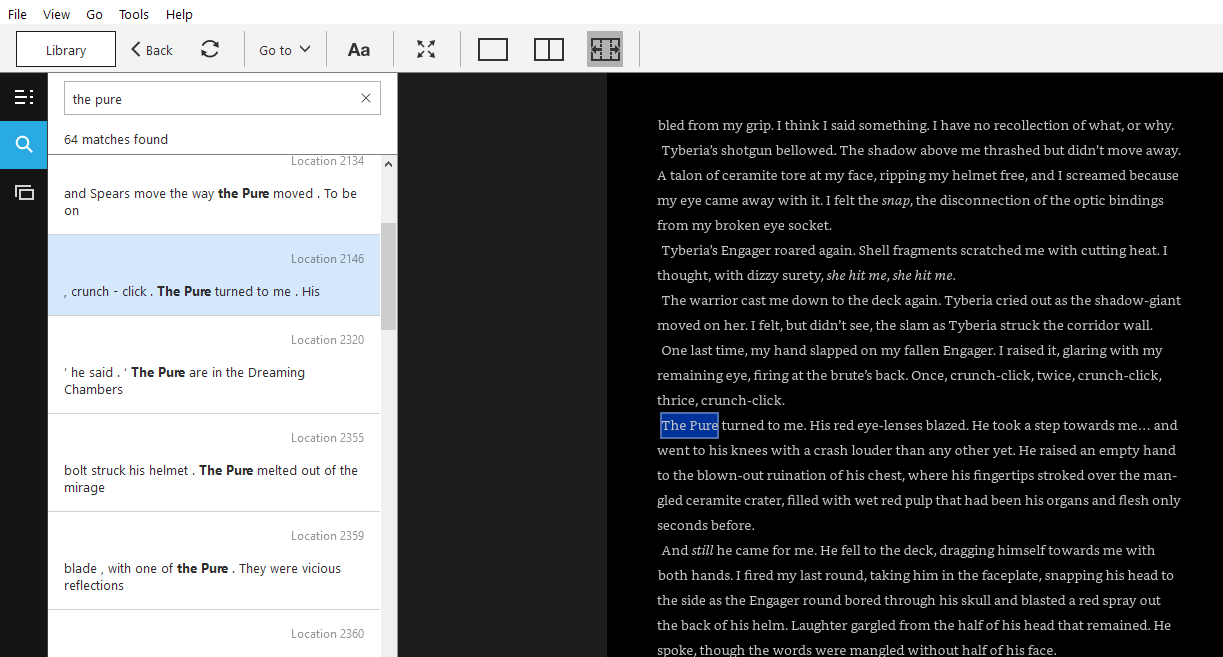 The Kindle app for your desktop PC has a power search function. Use it wisely.Note that the Pure have red lenses. Something I missed on my original source check as I swore they where mentioned to be green. Whoops. Book is Spear of the Emperor by Aaron Dembski-Bowden, you can buy it here.