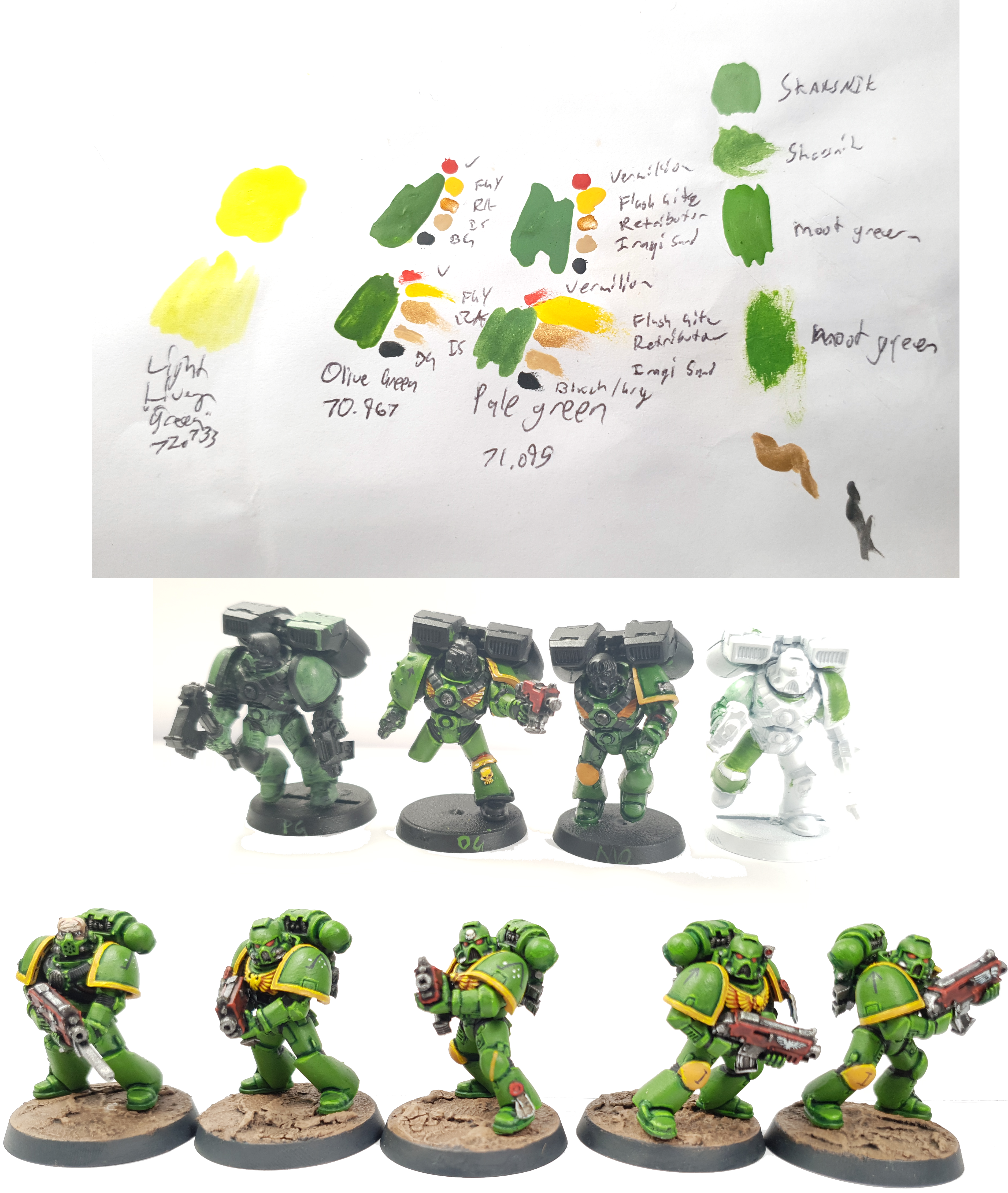 Note how I'm not finishing each model. Pale Green was the first colour to drop. It didn't match up with the type of green I wanted, so I progressed further with the others, finally I dropped the Medium Green after I washed the green washed the model and more or less completed the Olive Green test model. Then decided to try it on a white primed model, which failed pretty hard within a few armour panels.