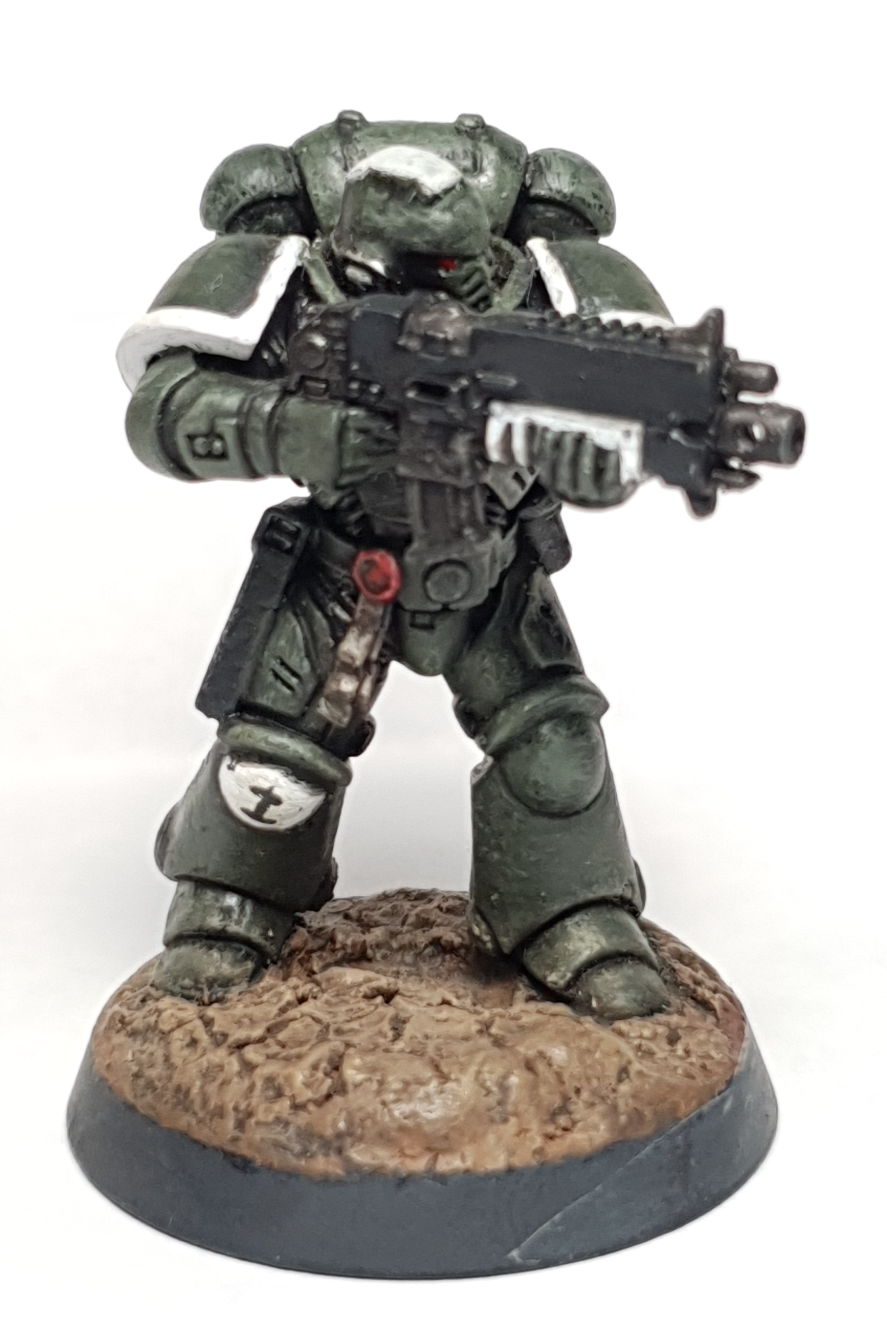 Sword's test model in all its glory. He kept his white bolter hand guard, while I ditched it on the rest of the army as a time saver. I figure this can a little nod to him being the first of the reborn chapter.This guy is that test model, I ended up abandoning the white segment of the bolt rifle to save time but allowed him to keep it to honour his place as the 1st of the newly forged Swords of Davion. Also don't worry about the test schemes that didn't quite work out as they have a way of popping back up fro later use. For example I recycled the 'classic' sword scheme for my Swords of Davion Kill Team as the black felt more right for covert ops.
