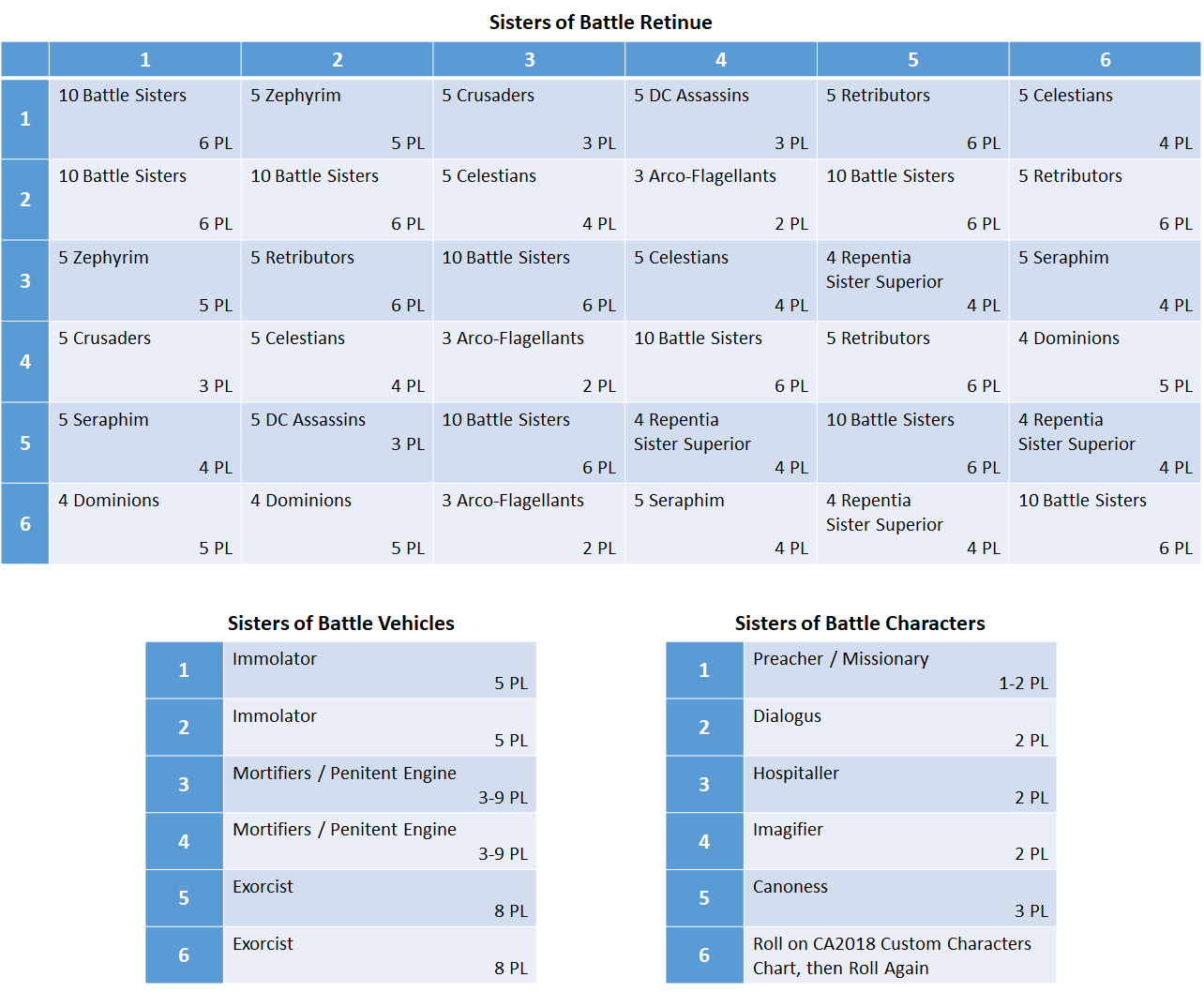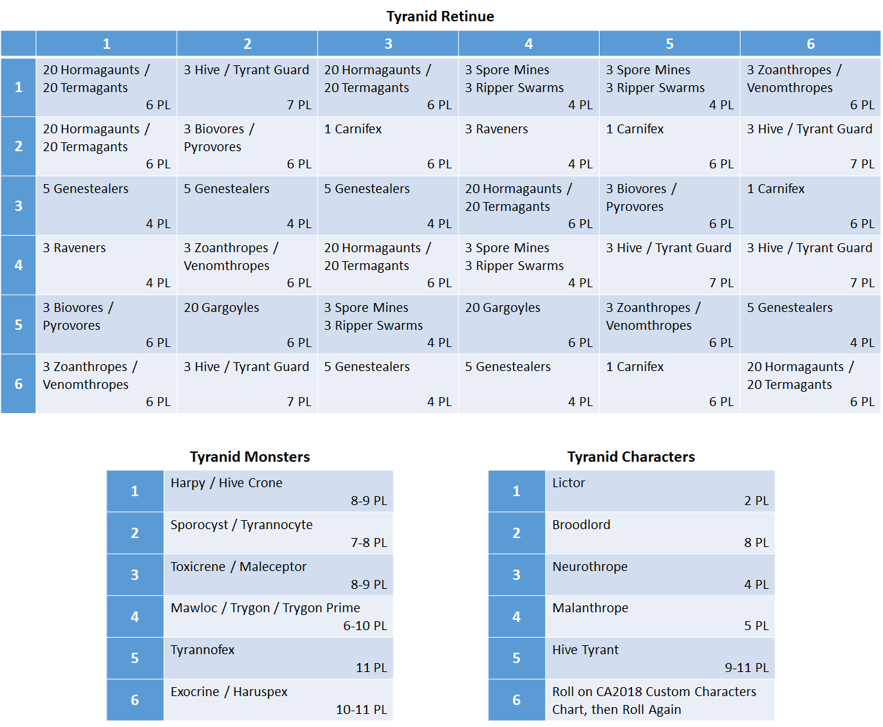 Kevin: The chart above gives me the flexibility to do that. I can fill the ranks with troop units and infantry from the big chart, and then if I want to have something sufficiently terrifying I can add a monster or a character. Unlike the original chart I didn't bother with doubles being Troop units or whatever, I just put together a distribution that made sense to me and limited options to between 4 and 7 PL.