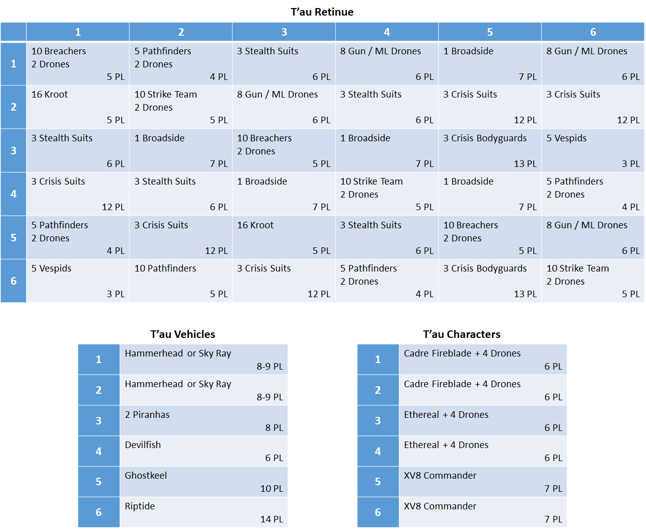 We also had to figure out a way to make this work with points instead of Power Level. Units in 40k can be all over the place, with the wargear and model counts adding up to wide range - take a unit of XV-88 Broadsides, for example. It can be worth anywhere from 86 to 510 points, and 7 to 27 PL. This would mean rolling on the table for a unit, then adding wargear and models to total up the points, and then rolling again until you hit the agreed-on cap, and then not being able to change it. This sucks.