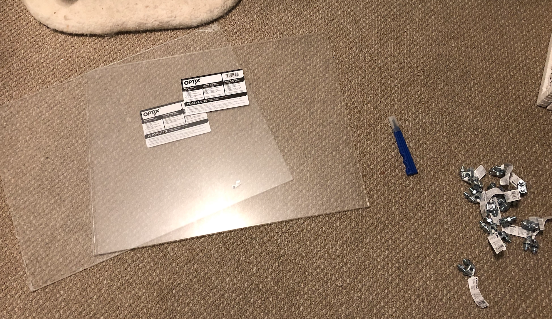 - For the shelves themselves, I got two of these. The size was dictated by the measurements of the Detolf, which was about 12"x14". A 24"x18" sheet yields two shelves with a bit leftover, but if they'd had 24"x36", or even 24"x30", I could have gotten 4 out of a single piece. As is, since I didn't want to stop at a second store or wait for shipping, I had to get two smaller pieces, but that's fine. So that covers the length and width. In terms of depth, I found .22 inch to be about right - anything thicker is just going to be more expensive and take more work to cut, and the next thickness down, .10 inch, was too floppy.