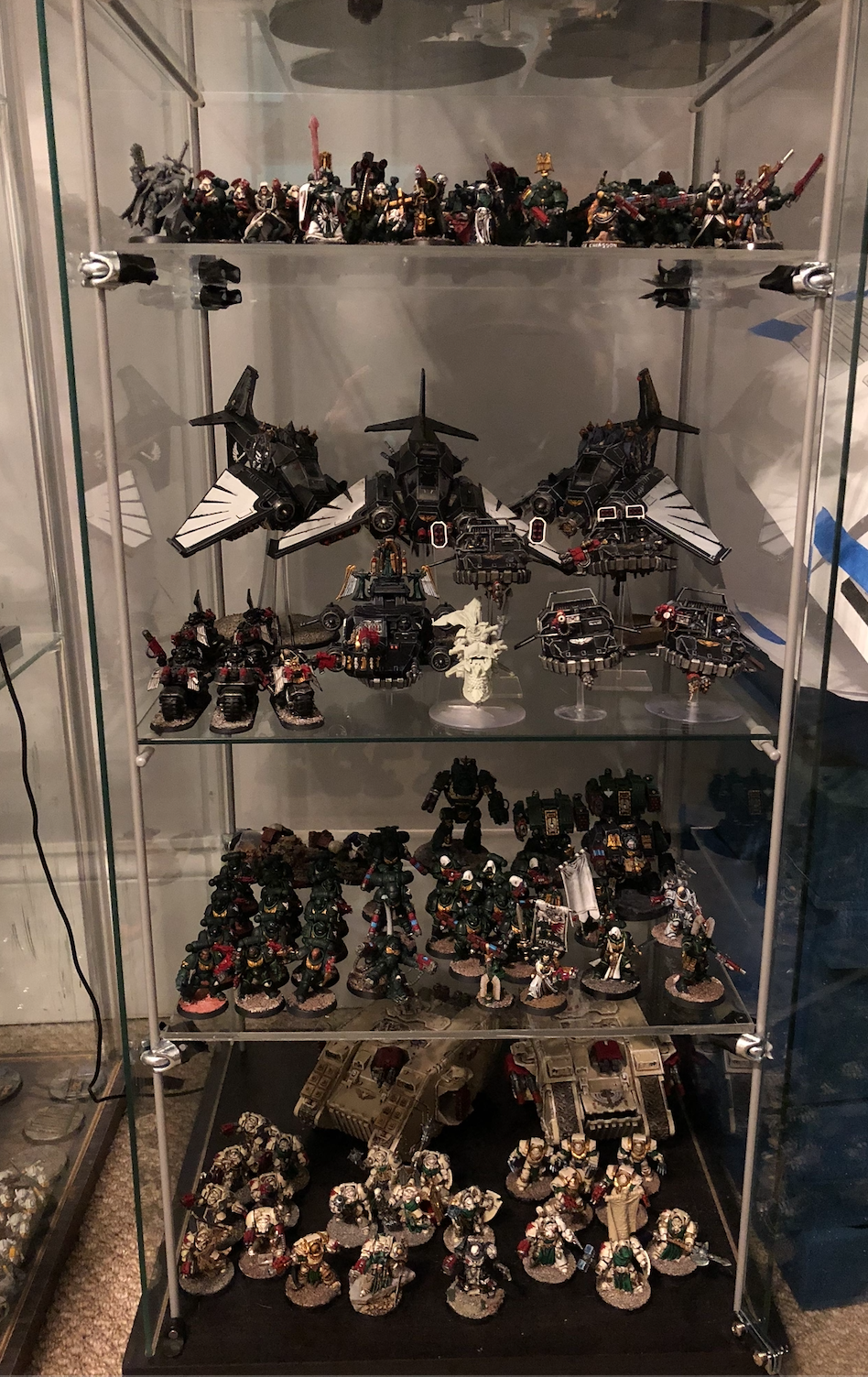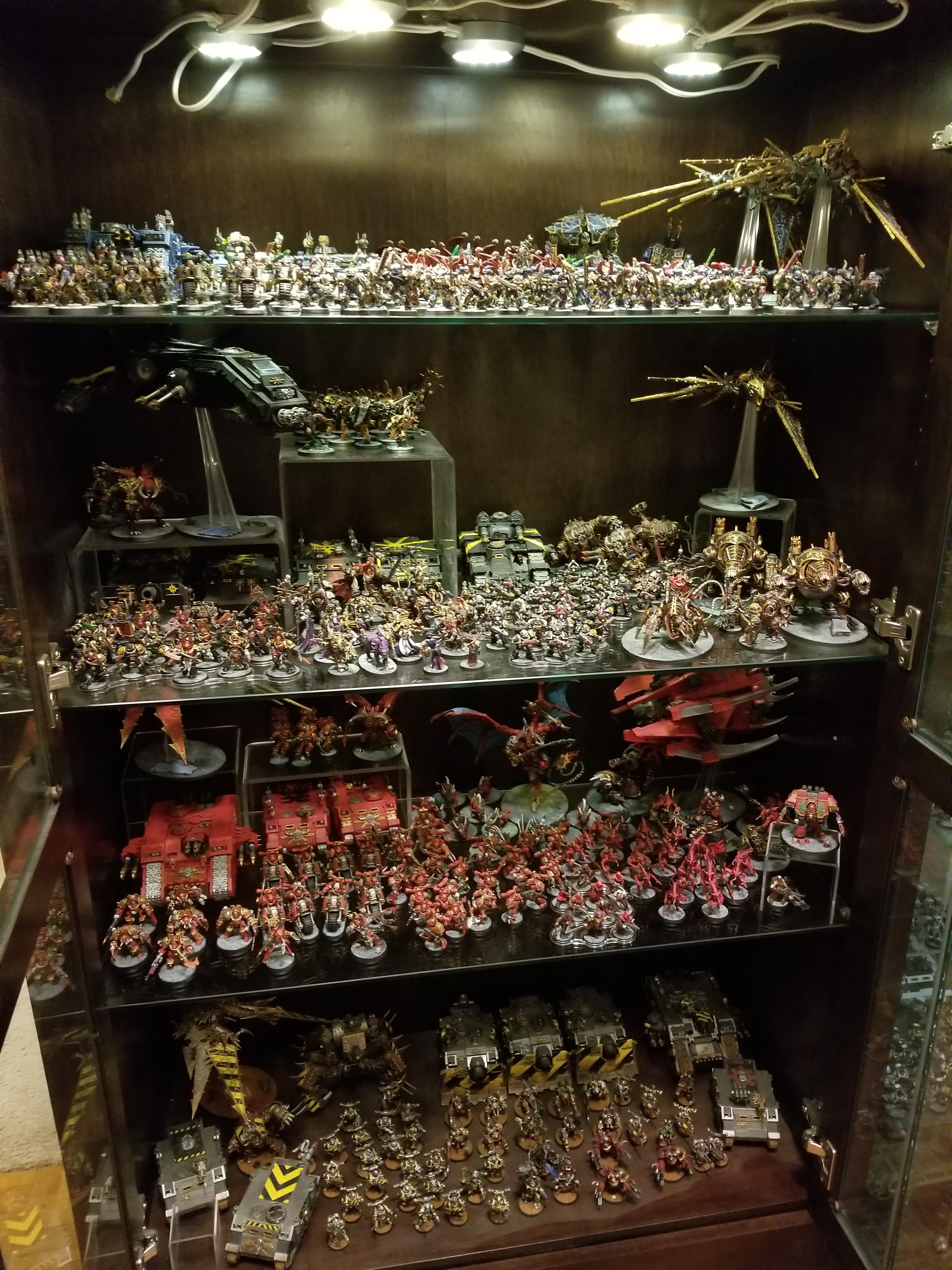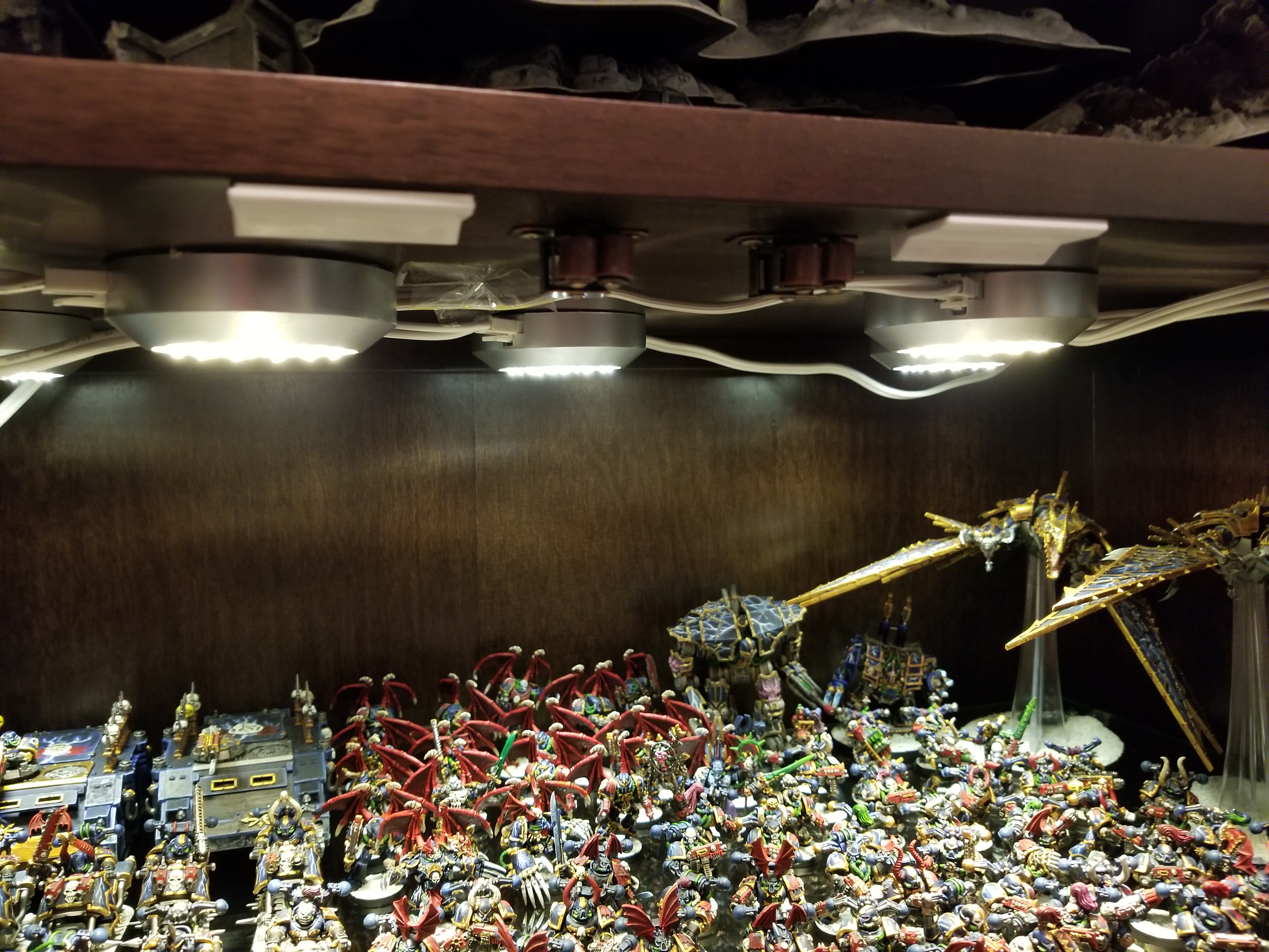 I dare you to find a finer example of carpentry. Credit: TheChirurgeonThe lights were easy to install (I just screwed in the mounts to the underside of the case's top), and they really do add a lot to the overall effect. The only downside is that the more you put on the upper shelves, the less light makes it down to the bottom shelf. Which is why I put my Iron Warriors down there. Both because they're my worst-painted army overall, and because it's fitting narratively for them. At some point I realized I'd need more space on my shelves and I was wasting a ton of vertical space, so I spoke to Greg and he recommended plastic jeweler's case riser inserts, which gave me cool platforms to put flyers and jump infantry on, clearing up more space for other models. I tend to organize my armies on the shelf with the main warlord in the middle, the troops up front, and large tanks and war machines to the sides and back, since they'll naturally sit higher and be visible over the rank-and-file models anyways.