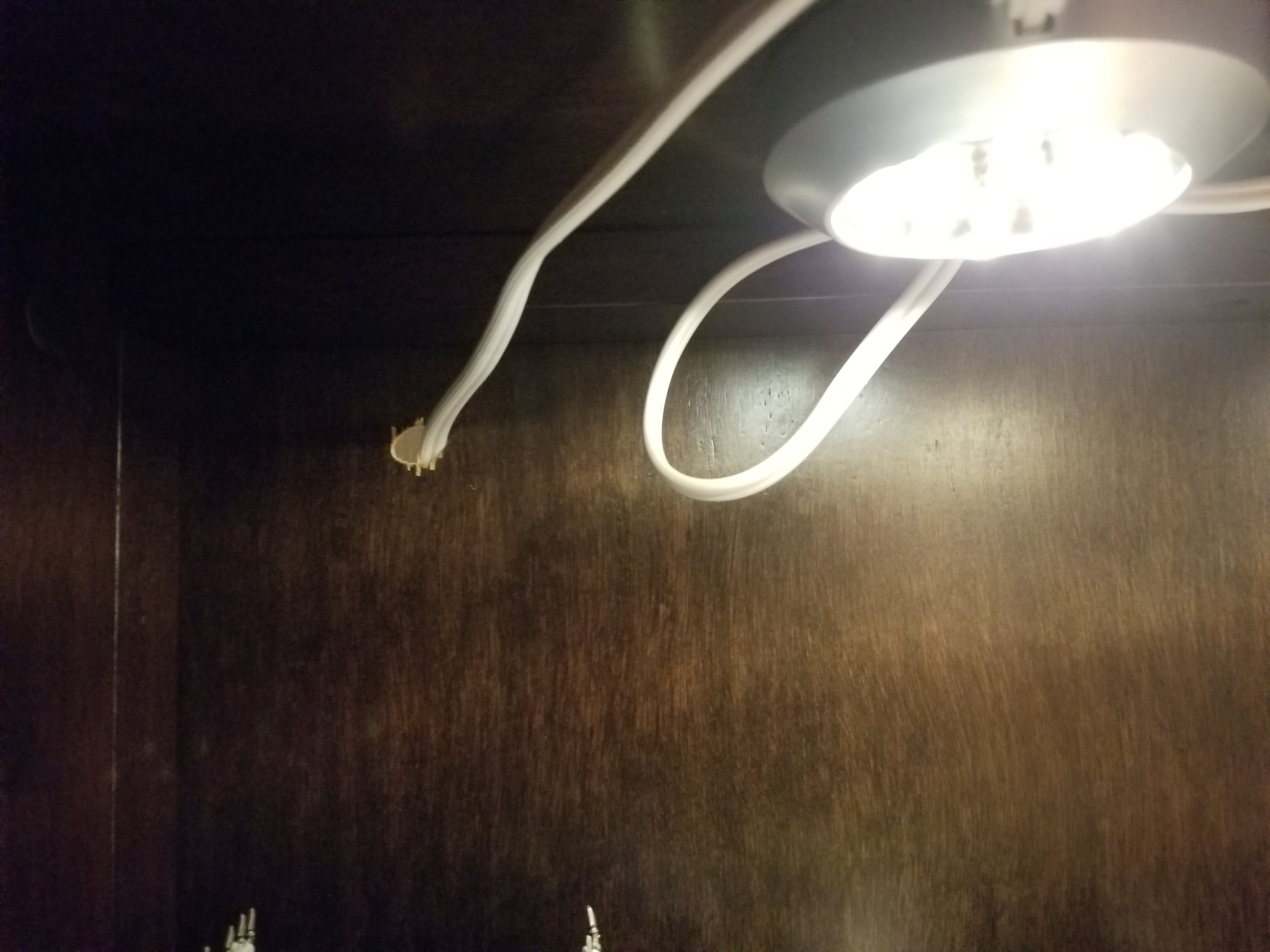 Ignore the loyalist scumbag marines. Those were just a phase. Credit: TheChirurgeonIf you spent any time on the cabinet's product page, you may notice that it does not come with built-in lighting. About two hours after I had assembled the cabinet and put minis in it, I found myself saying "shit, this needs lights." And so my plan to just have a cabinet turned into a hobby project all its own. If I were doing this today, I'd probably install lighting strips, which are easier and more effective. But I was (and remain) an idiot, so instead I installed LED cabinet lights that I ordered off of LightingDirect.com. They serve the purpose well and I was able to install 5 out of the 6 I ordered pretty easily, then drilled a hole in the back of the cabinet to run the cable for them through. Sadly, they're starting to dim a bit so I may be ordering new ones soon, but they've run very well over the past seven years.