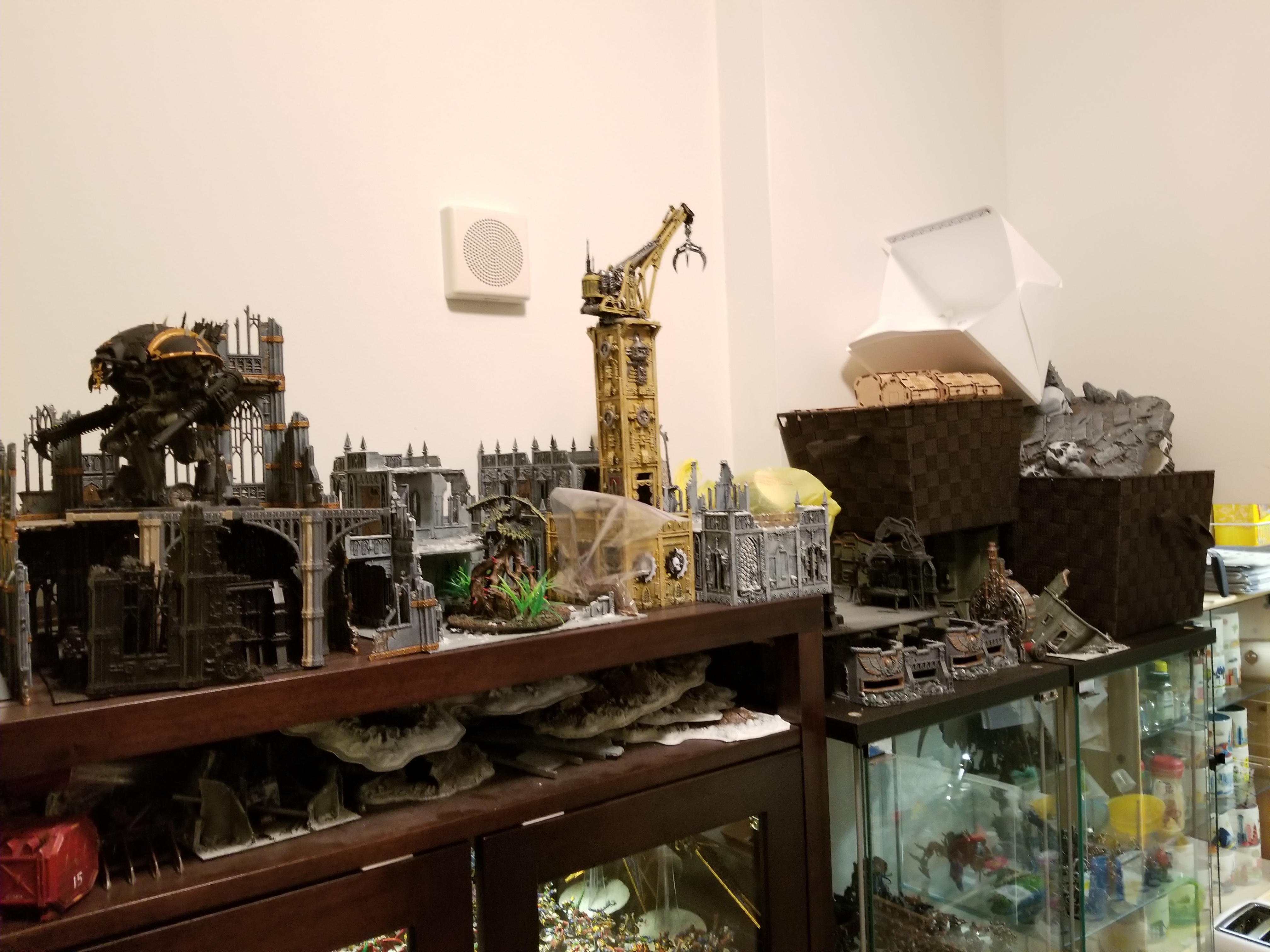 Fuck, I need to dust that bottom shelf. Credit: TheChirurgeonBecause I'm short on space, I use the tops of the cases for terrain storage, so it's easy to grab a table's worth whenever I'm about to play a game. I have a Tetris-like configuration for the buildings, and everything else goes into one of the baskets. I also have a closet I keep some other, larger pieces in, but that's in my son's room and so I only put stuff in there that I'll be OK with grabbing in advance.
