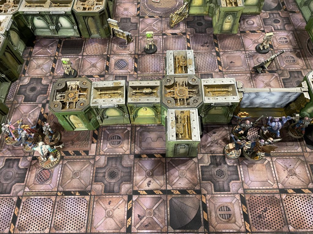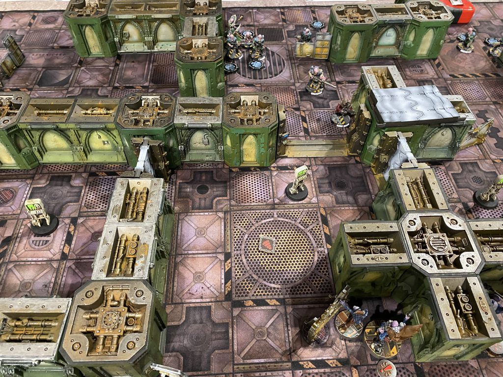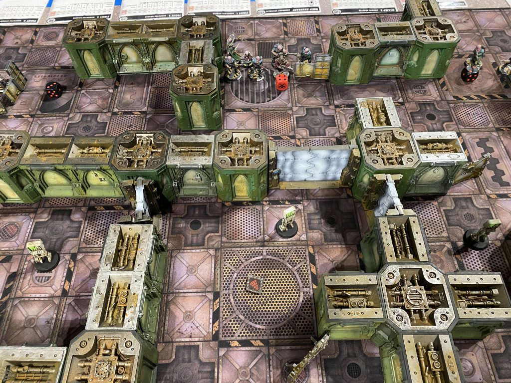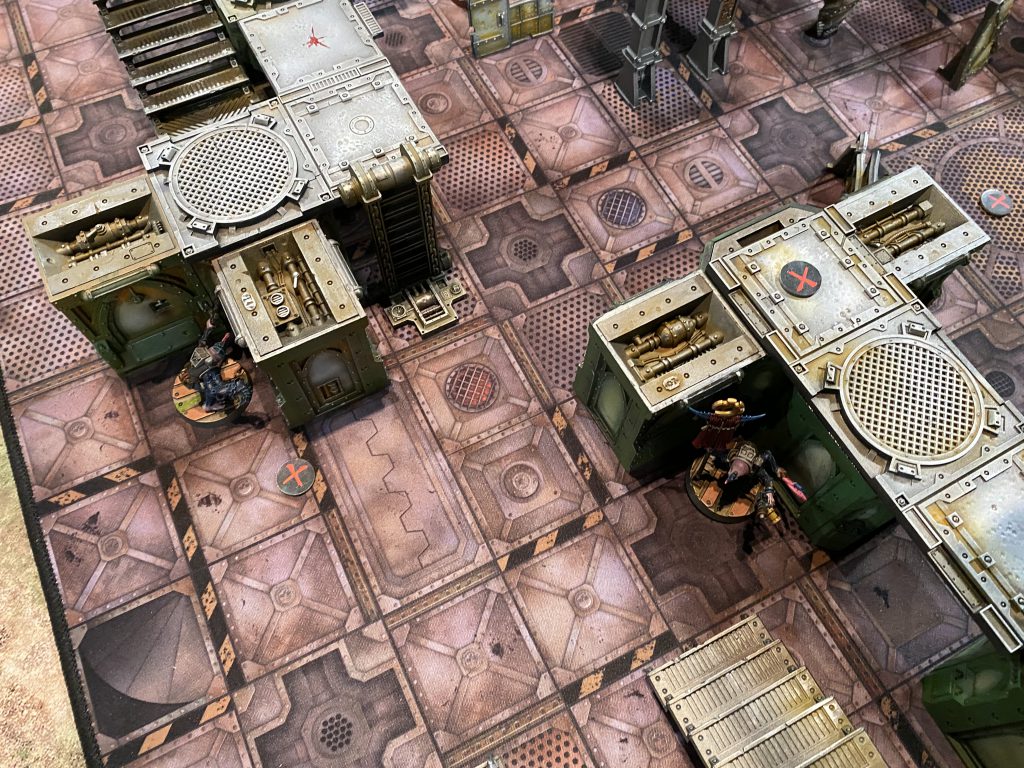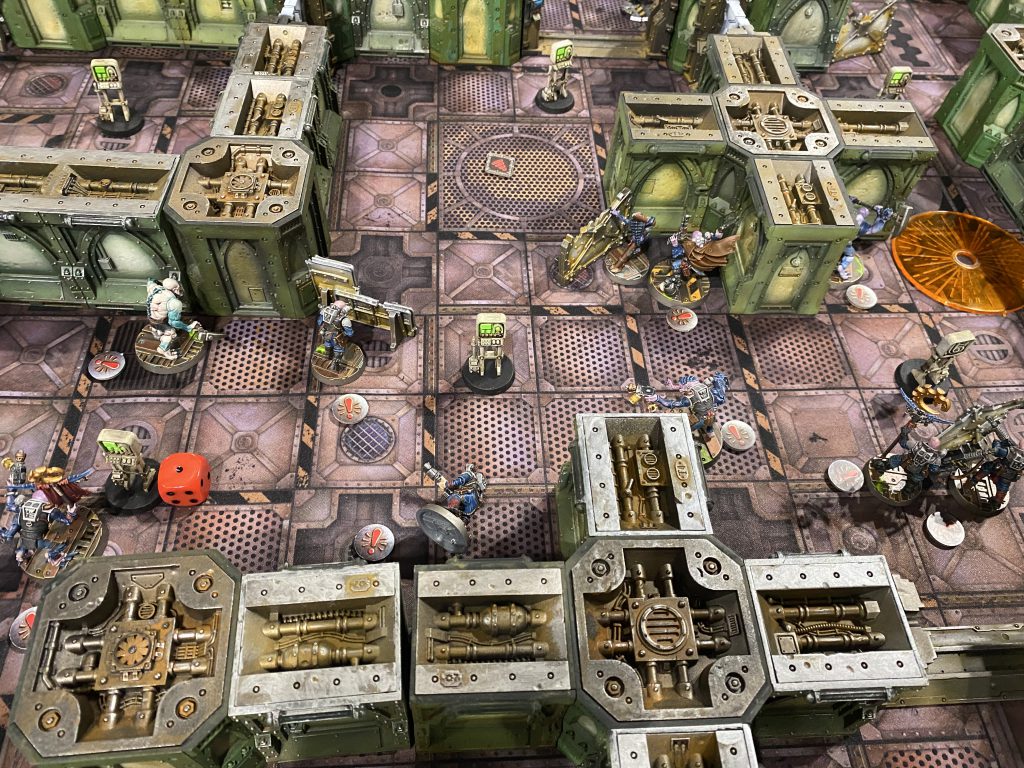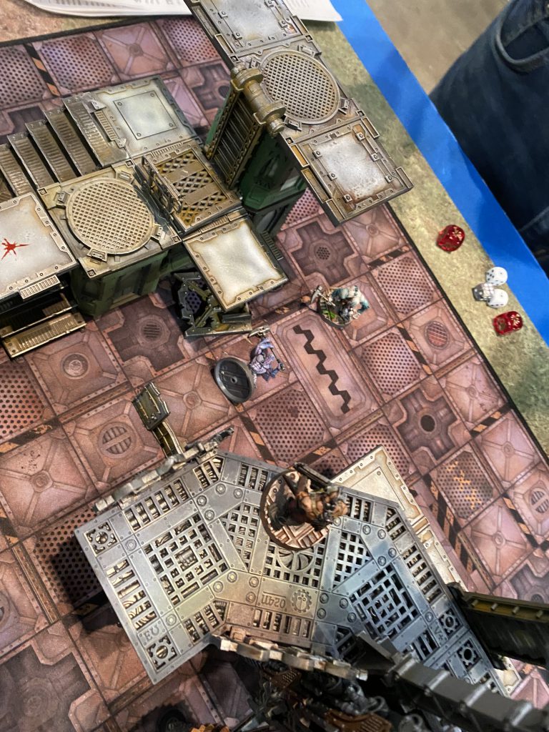 So if you have been reading my other Adepticon articles, especially my event overview this name might look familiar. Christian was my roommate for the weekend, and is local to me. He is a very avid Necromunda player, and knows the game inside out. We have a bit of a history where-in his Goliaths have tended to dominate our local campaigns, with my GSC being the only gang that has been able to thwart him. We have a large number of games against one another, and honestly I was thrilled to see he made it to the top round on his FIRST Adepticon. While my matches had all gone their full length Christian had apparently steam rolled his opponents. Opting to bring only 7 Goliaths loaded to the brim with gene-smithing buffs every single one of his guys was a powerhouse of muscle and incredibly lethal in close combat. Every champion, leader, and specialist had Nerves of Steel, and every single model was Toughness 5. In addition, more than a few models had 3 wounds (one had 4?), and one even had damage reduction. I can't give you the perfect breakdown because basically they were all tough to kill as far as my guys were concerned. We opted to play our final game on a Sector Mechanicus table, which were definitely the highlight of the event, fantastic setups.