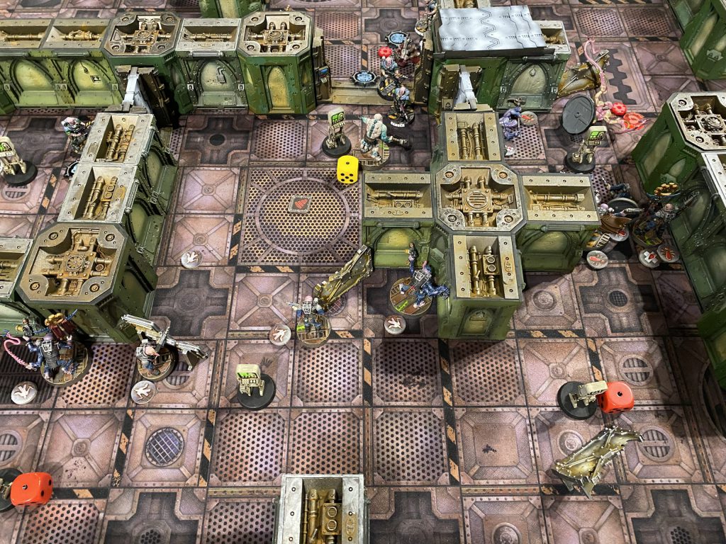 After a first round of largely dancing around one another trying to maneuver ourselves into position, Christian drew first blood by exploding one of my observing neophytes with a boltgun. What proceeded up top was a brief shoot out between two lasgun neophytes and the boltgun goliath while the other two ran away from two kitted out melee specialists (one so bulky with muscle that he could only move 3 inches) firing shots over their shoulders.