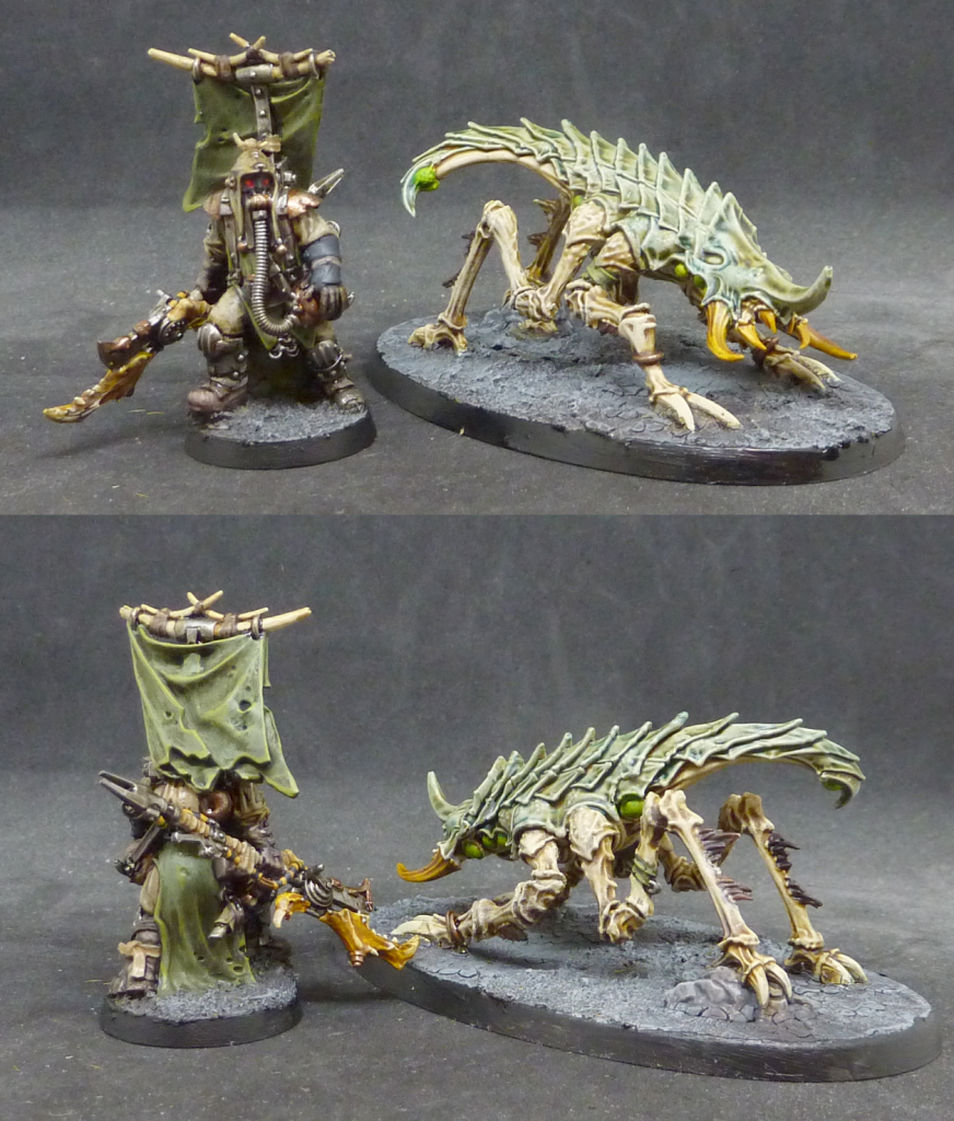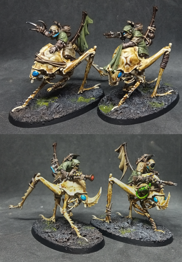 Atrhromite Duneskuttler and Herder. Credit: Soylent Robot. Bluesky: https://bsky.app/profile/soylentrobot.bsky.socialAgain, Nomads are very heavily restricted compared to hive gangs. The only current hangers-on available, RAW, are the Arthromite Herder, and the Brute which is the Herder’s raison d’etre, the Duneskuttler. The Brute is damn good actually. Big, expensive models that are purely for melee have their issues. But this is heavily armoured, punchy, and fast at 6” Movement. We should note that it has Nerves of Steel, but on an unreliable Cool of 8+. Might actually be worth spending an Advance or two there. The other possibilities that tickled our fancy were taking Spring Up, and/or Sprint, from the Agility tree. That’s Secondary so would be a hefty 12XP for either. But Spring Up would be a nice additional chance to un-Pin, after trying to resist it with Nerves in the first place. Sprint, on a fighter that will almost always double-move when it can’t Charge immediately, would really add mobility. The Herder is just a 40-credit investment to safeguard the Duneskuttler from Lasting Injury (he stops any risk from Critical Injury results, and can roll to heal other debuffs between battles), or if that effect isn’t needed, he can roll to drip-feed it D3 XP after each battle.