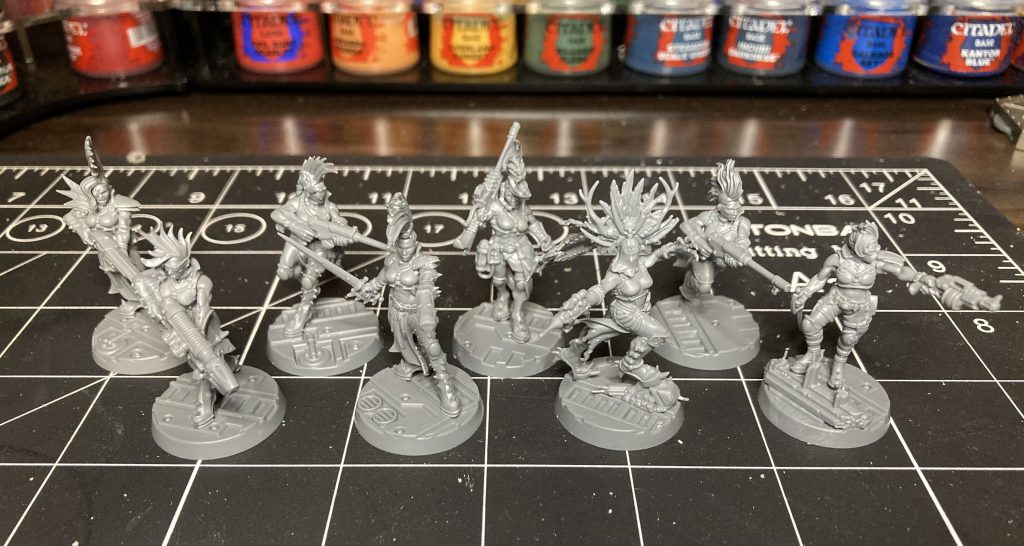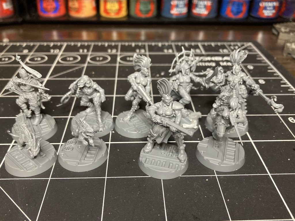 It’s only the first week of January and I’ve already built almost all of these ladies! I built 9 more models beyond the starting 8 so that the gang can grow over the course of a campaign or if I want to try different starting gang builds. With the eventual purchase of a Khymerix, my completed gang will have a total of 18 muscle punks.