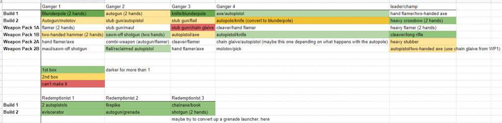 The idea behind this gang is that they’re a bunch of insane nihilists who follow the Path of the Doomed. Specifically, they adhere to the tenets of the Cult of the True Resurrection and believe that the Imperium, including the Emperor, must be destroyed so it can be Reborn. You can imagine how this might rub other hivers the wrong way. So for this gang, I’ll need a solid core of Cawdor gangers with the best basic weapon in the game, and then plenty of juves to act as bullet sponges and to fill out all the extra Juve spots that a Path of the Doomed gang can generate during a game. So, I did some planning!