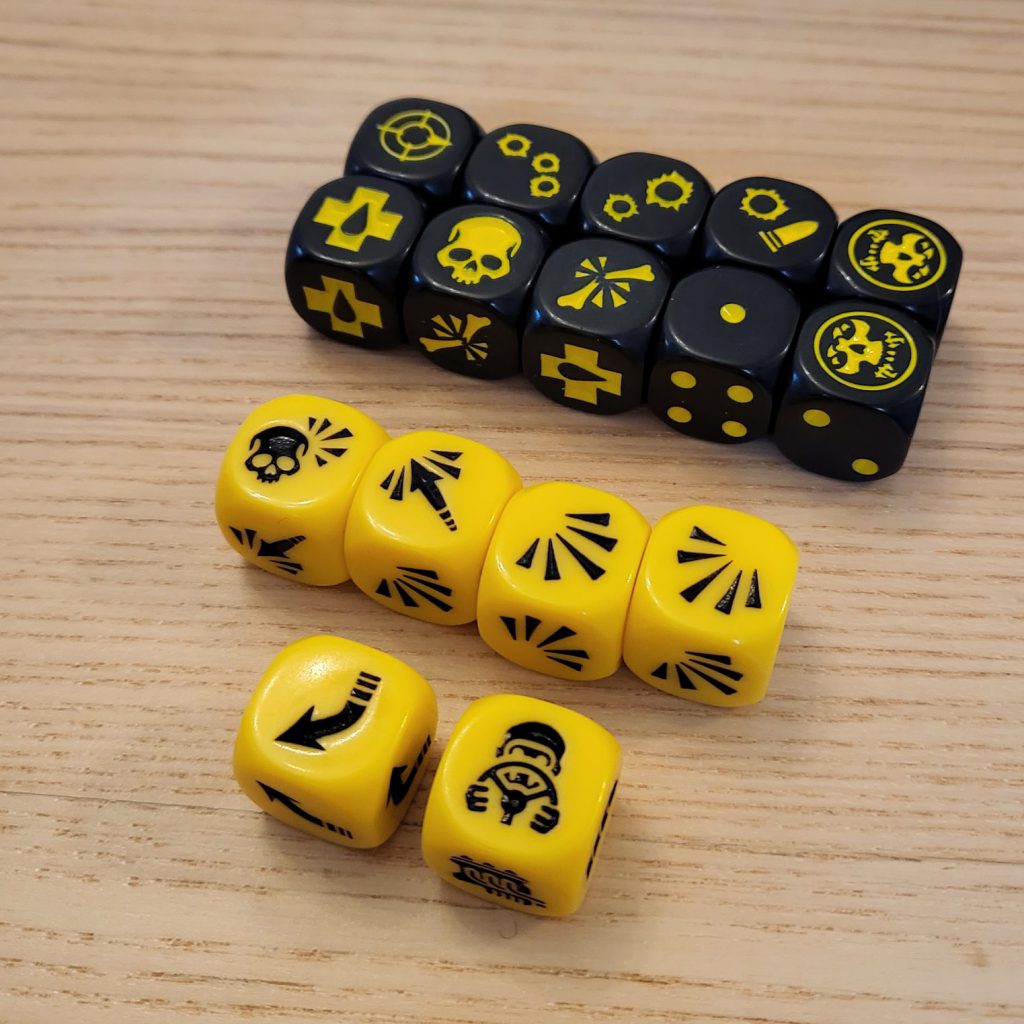 This is all the typical stuff you would expect in a starter box. Some new tokens cover vehicle-related statuses. You can never have too many activation pogs. Rather than having the same set of dice in two colors, this box has one set with the standard Necro dice in black and the new vehicle ones in yellow. We’ll cover the function of the Location, Damage, and Control dice later in the review.