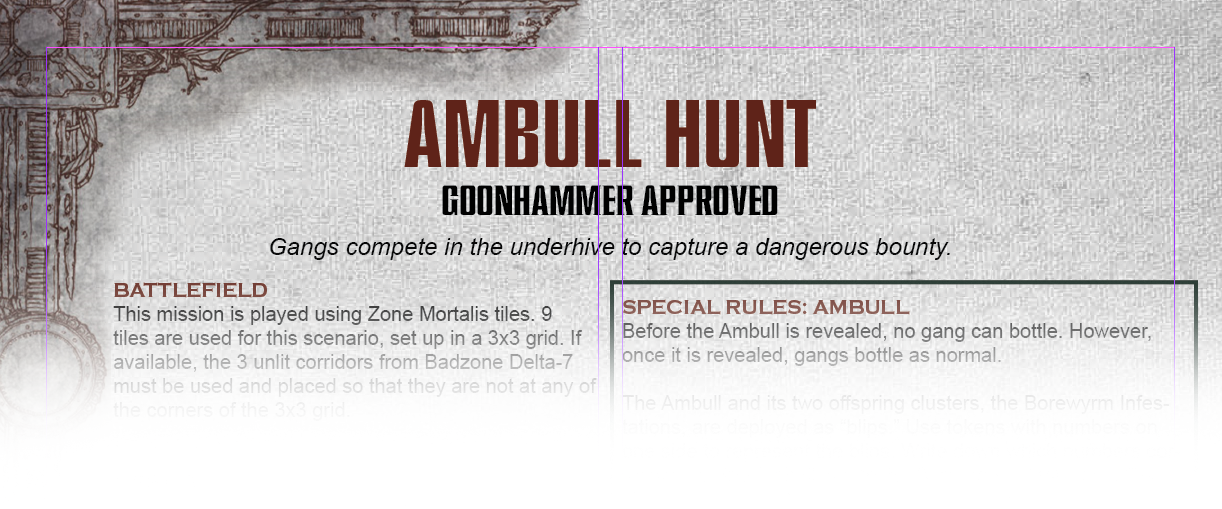 The bones of this scenario were first sent to me by a Something Awful Goon called enentol and I tweaked their work for Merton and I’s Cinco de Necro event in 2019. The idea is that 2-4 gangs have been tasked with tracking down an Ambull in the Underhive. They’ve managed to locate its nest, but haven’t yet been able to get eyes on it. That’s where the gameplay cuts in. The gangs are trying to secure the Ambull carcass or any Borewyrm carcasses for a credit reward from the local Guilders. Since an Ambull is a...rather large specimen, instead of dragging it out and bringing it back to their hideout, the gang that takes it down will have to defend their kill where it lies, and chase off any enemies so they can “process” it at their leisure. This game is specifically designed to be played on a 3x3 grid of Zone Mortalis tiles, but it can be turned into a Sector Mechanicus game with little trouble.