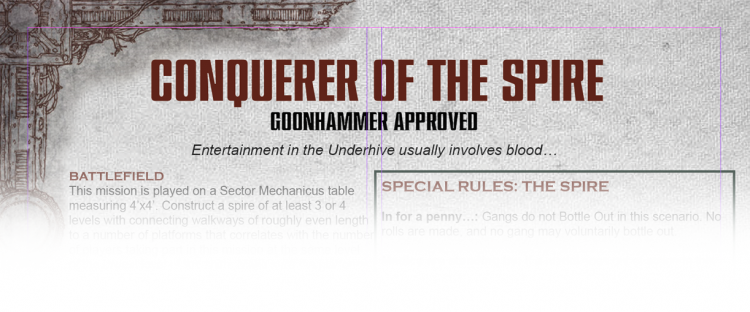 I got the idea for this mission from the last section of the ancient Outlanders book (my copy is literally falling apart!). In that book, Andy Chambers (I think) created a gladiator-style mission for multiple players called “Lord of the Spire”. I never got to play this mission in its day, but I absolutely loved the way that they had set it all up. The powers that be in the Underhive have rigged up their own entertainment event, and in Necromunda, entertainment almost always means blood! Gangs are fighting over riches atop gantries that hang above a seemingly bottomless pit of sludge. In addition to the enemy fighters, there are a bunch of “buttons” set about the battlefield that will either grant boons or hinder the enemy. This mission is designed with verticality in mind, but it could be adapted to suit a Zone Mortalis board easily enough. Think Conqueror of the Pit in that instance.